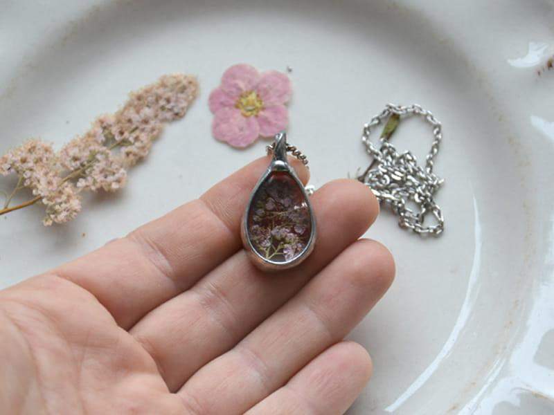 Uroczy naszyjnik z zamkniętym w szkle różowym kwiatuszkiem. Wymiary wisiorka to ok. 1,5 x 3 cm. Oprawa w kolorze srebrnym. Łańcuszek o długości 50 cm. Biżuteria w 100% wykonana ręcznie, poszczególne sztuki mogą się minimalnie różnić.