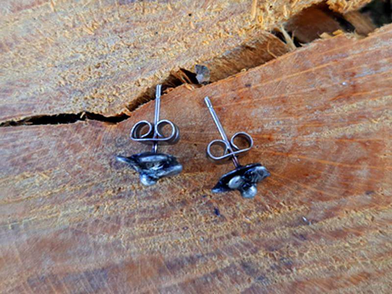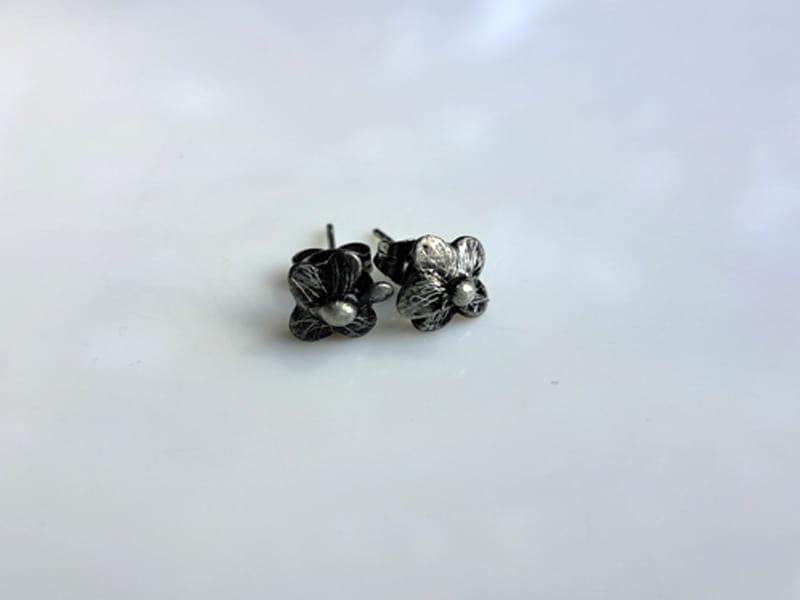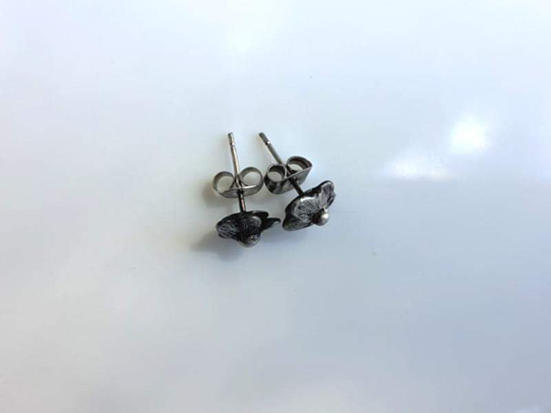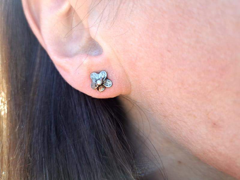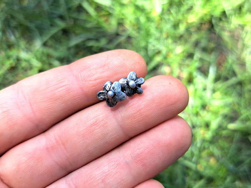 Malutkie kolczyki w kształcie niezapominajek. Kolczyki wykonane techniką metaloplastyki.