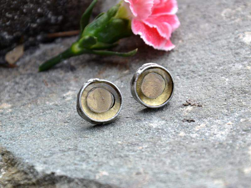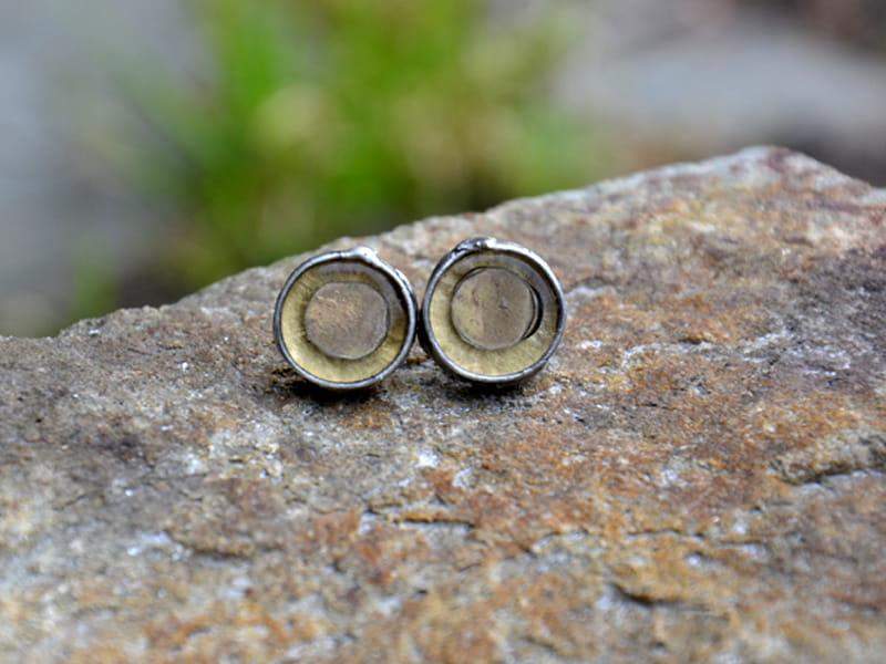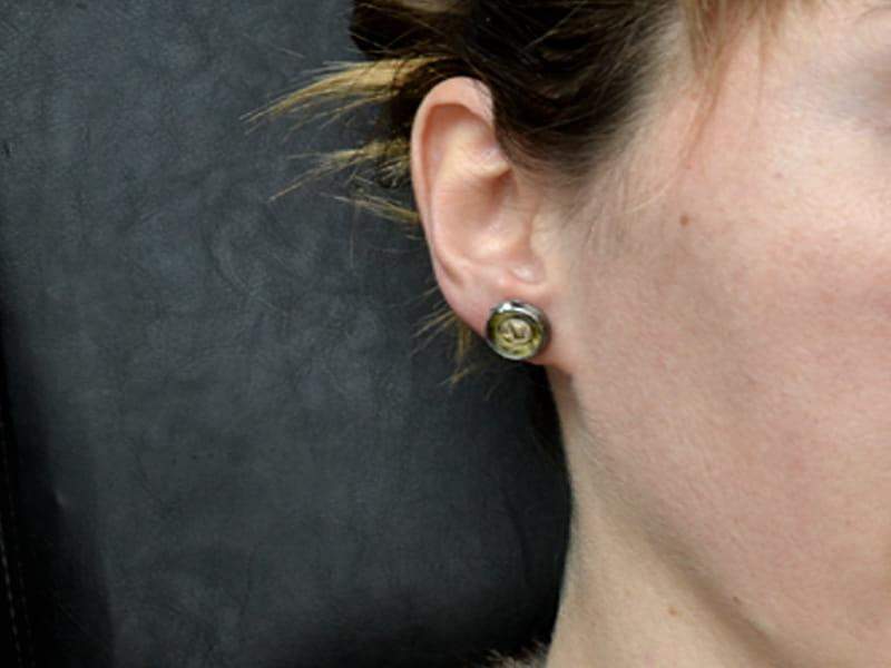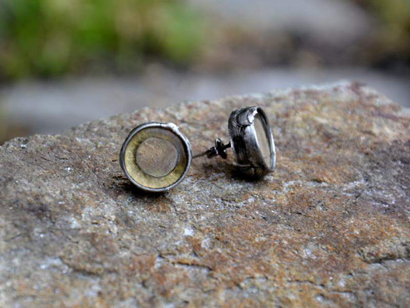 Kolczyki wkrętki ze stapianym szkłem w odcieniach złota i beżu. Średnica kolczyka to ok. 1,2 cm. Szkło oprawione w ekologiczną, bezołowiową cynę. Biżuteria w 100% wykonana ręcznie. Poszczególne sztuki mogą nieznacznie różnić się od siebie.