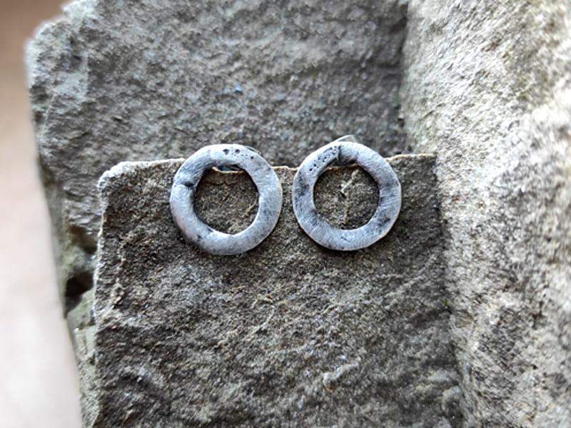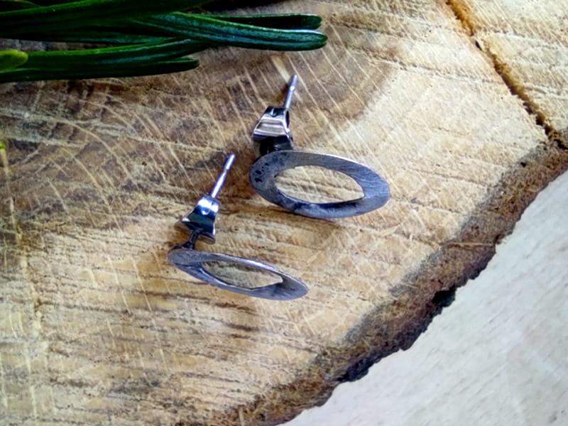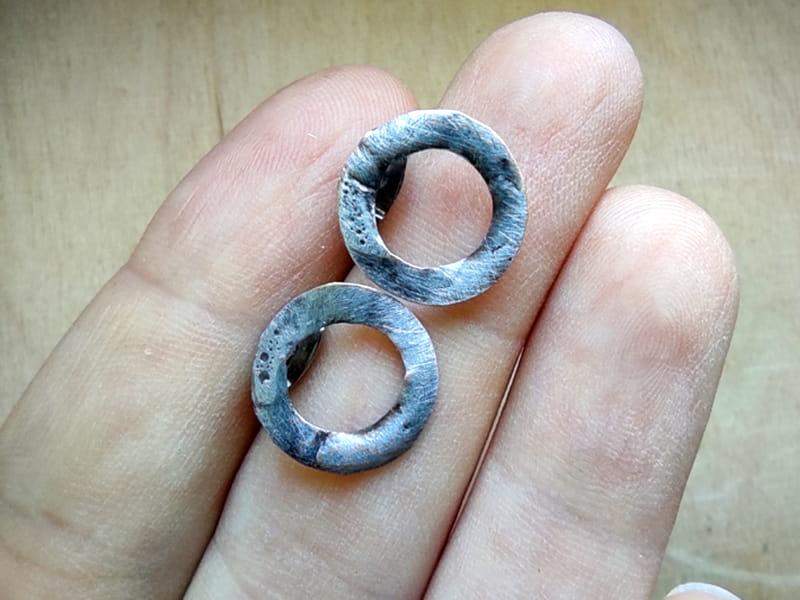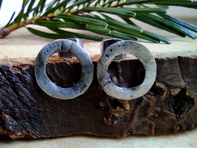 Minimalistyczne, rustykalne kolczyki wkrętki. Średnica kolczyka to 12 mm. Kolczyki wykonane z ekologicznej, bezołowiowej cyny stylizowanej na ciemne srebro. Sztyfty i baranki antyalergiczne, wykonane ze stali chirurgicznej. Biżuteria w 100% wykonana ręcznie, poszczególne sztuki mogą się minimalnie różnić.