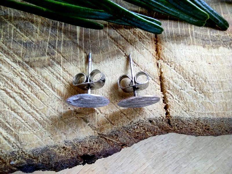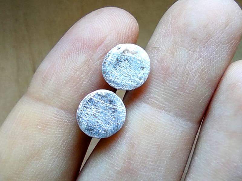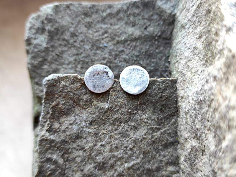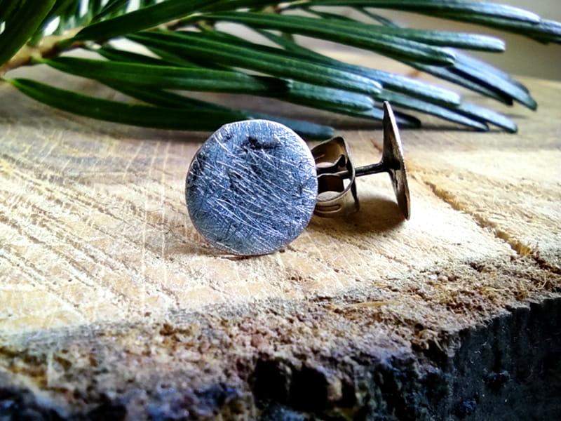 Minimalistyczne, rustykalne kolczyki wkrętki. Średnica kolczyka to 8 mm. Kolczyki wykonane z ekologicznej, bezołowiowej cyny stylizowanej na ciemne srebro. Sztyfty i baranki antyalergiczne, wykonane ze stali chirurgicznej. Biżuteria w 100% wykonana ręcznie, poszczególne sztuki mogą się minimalnie różnić.