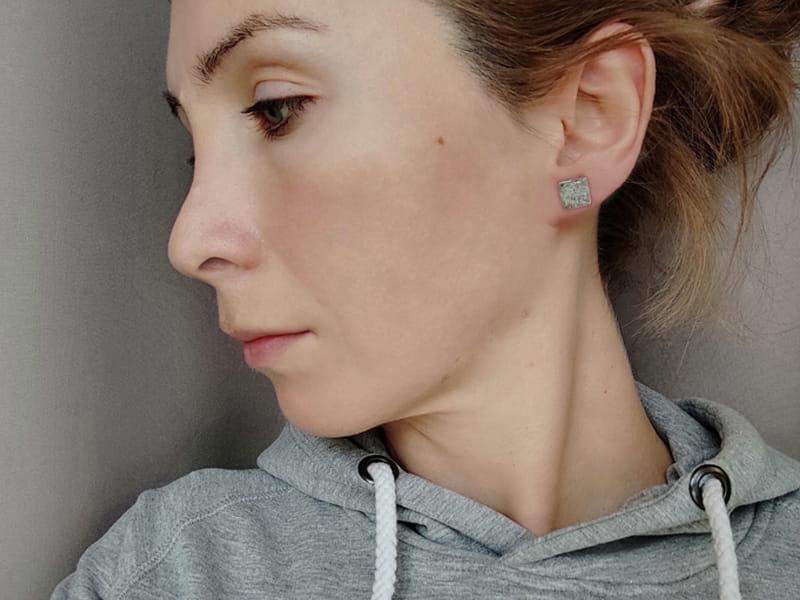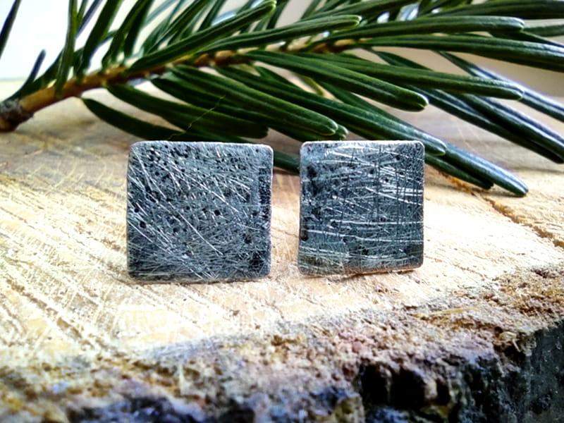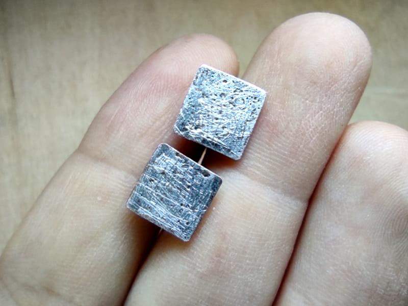 Minimalistyczne, rustykalne kolczyki wkrętki w formie kwadratu o boku 10 mm. Kolczyki wykonane z ekologicznej, bezołowiowej cyny stylizowanej na ciemne srebro. Sztyfty i baranki antyalergiczne, wykonane ze stali chirurgicznej. Biżuteria w 100% wykonana ręcznie, poszczególne sztuki mogą się minimalnie różnić.
