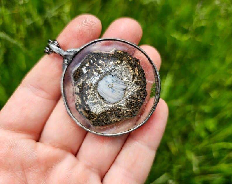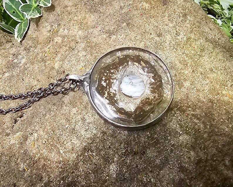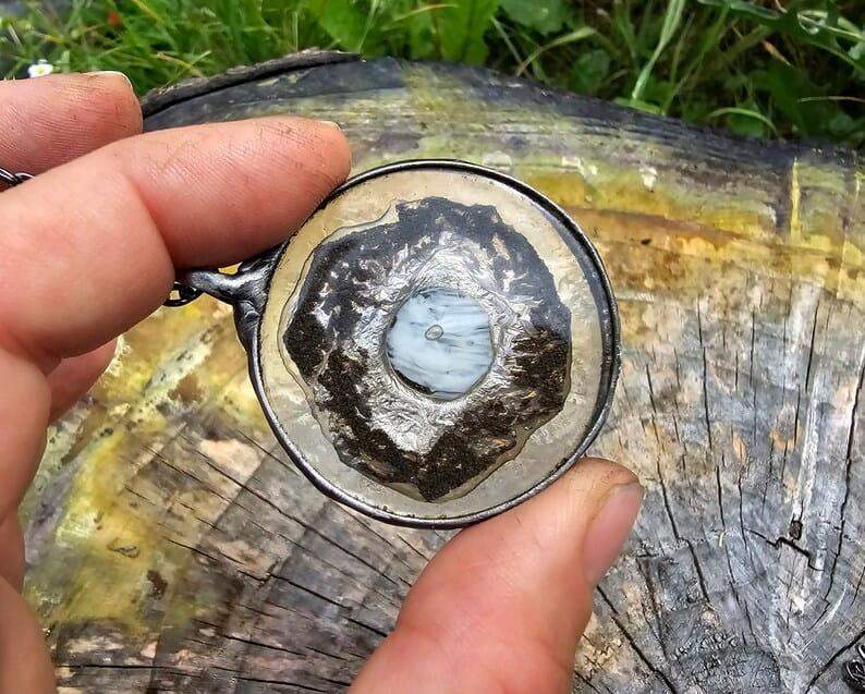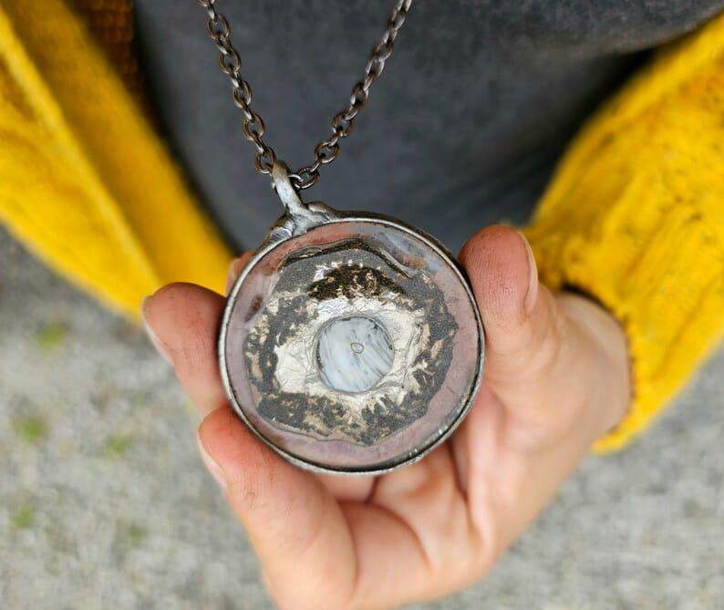 Efektowny wisior z oryginalnym szkłem w odcieniach szarości z oprawą w kolorze ciemnego srebra.