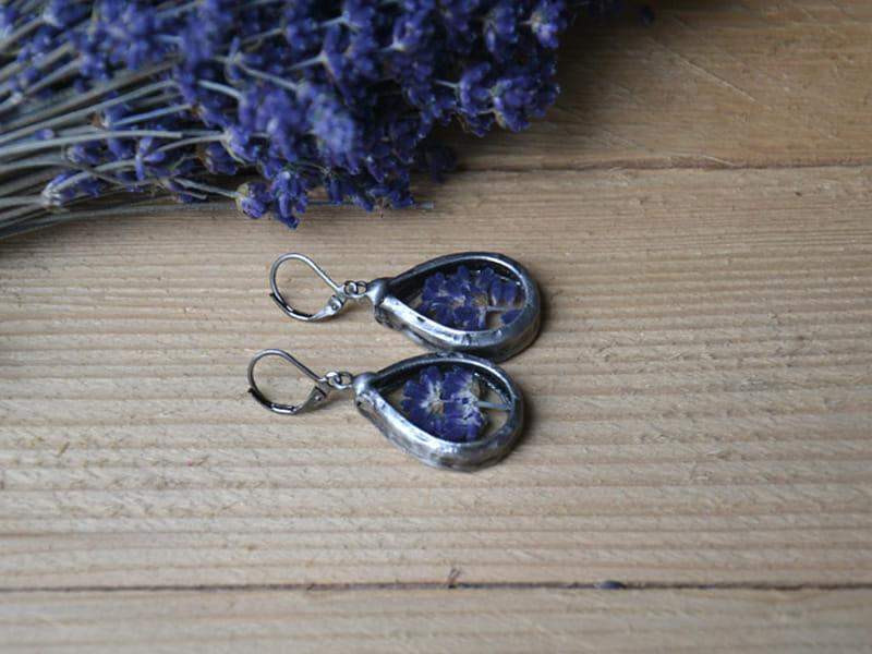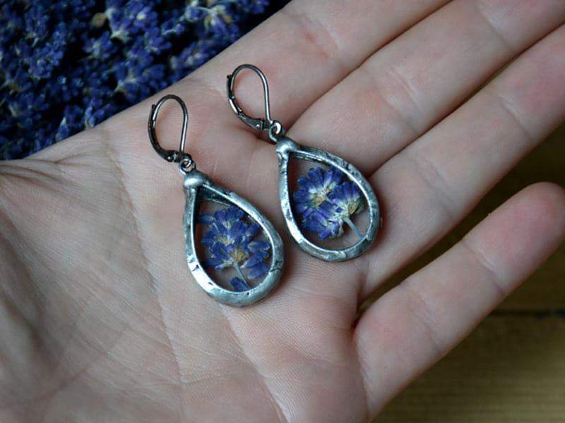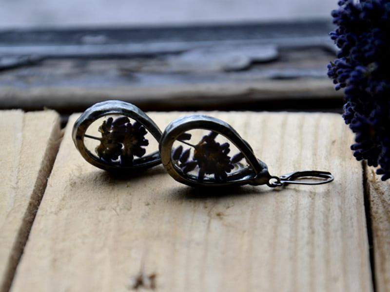 Romantyczne kolczyki z lawendą zamkniętą w szkle. Oprawa w kolorze starego srebra. Zamykane, antyalergiczne bigle. Długość kolczyka to ok. 4,5 cm. Biżuteria w 100% wykonana ręcznie, więc poszczególne egzemplarze mogą nieznacznie się między sobą różnić.
