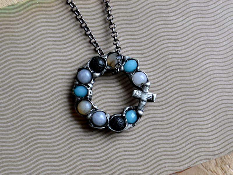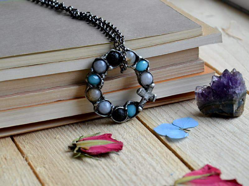 Naszyjnik z dziesiątkiem różańca wykonanym z kamieni naturalnych. Oprawa wykonana z ekologicznej cyny stylizowanej na stare srebro. Średnica wisiora to ok. 4 cm. Długość łańcuszka to ok. 80 cm. Biżuteria w 100% wykonana ręcznie, poszczególne sztuki mogą się minimalnie różnić
