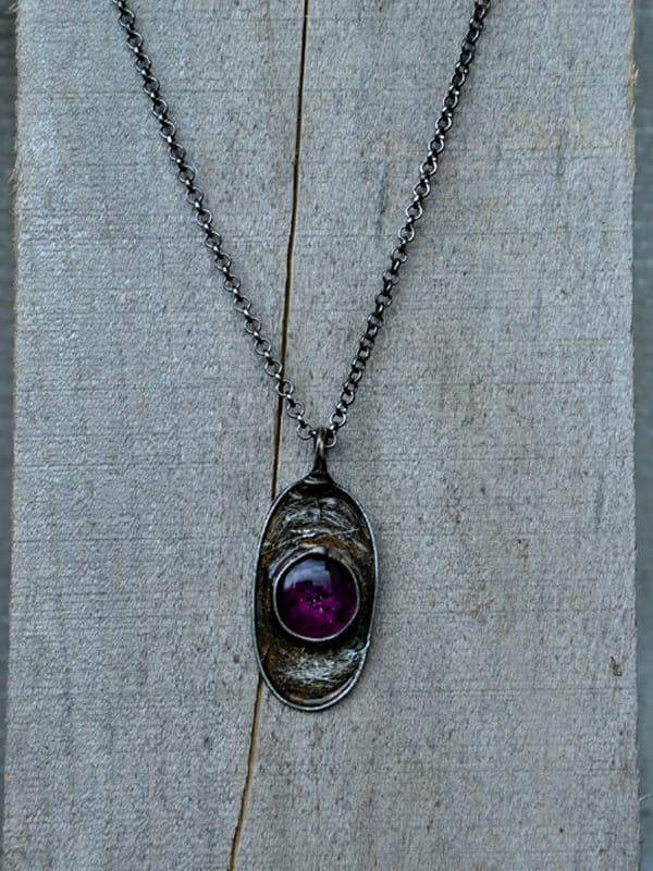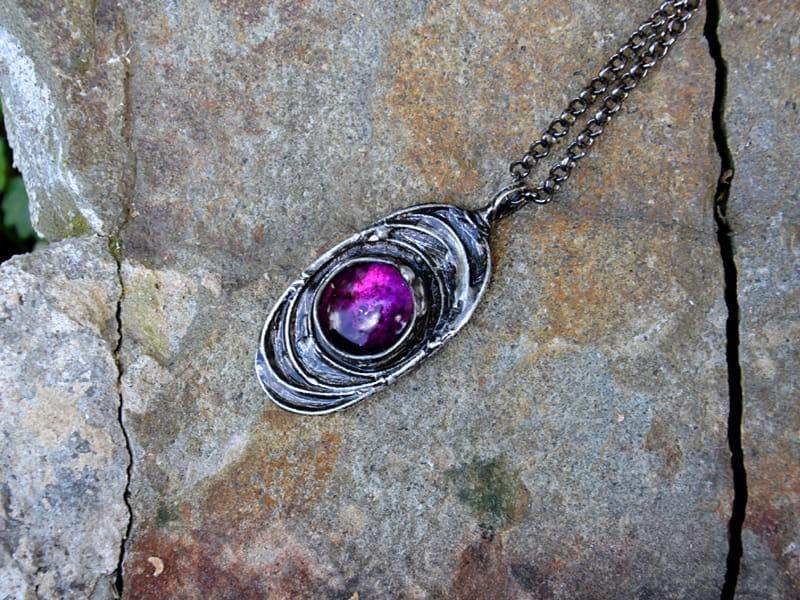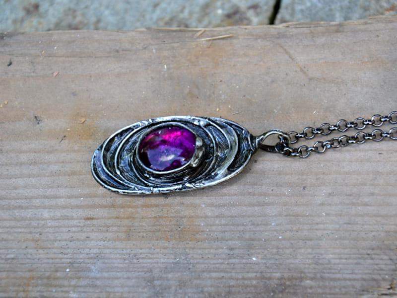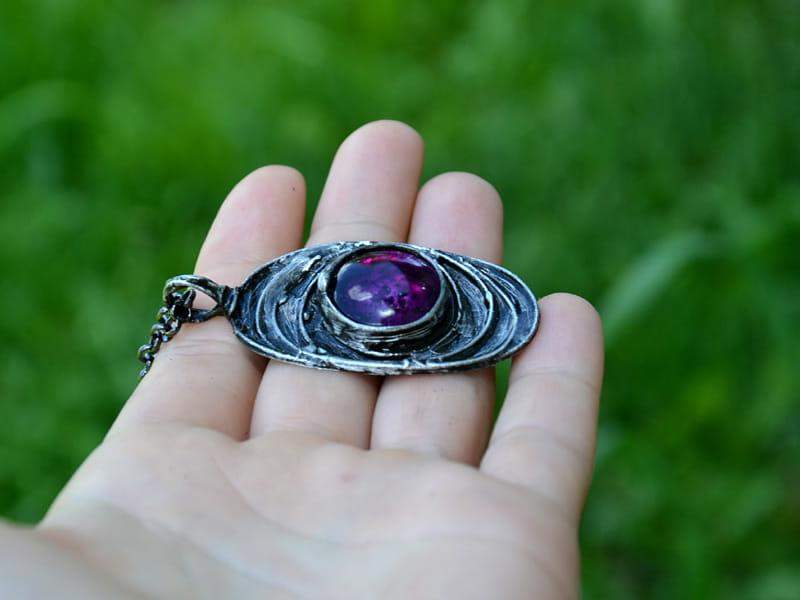 Rustykalny naszyjnik z fioletowym szkiełkiem. Oprawa w kolorze starego srebra wykonana z miedzi pokrytej ekologiczną cyną. Wymiary wisiora: 5 x 3 cm. W komplecie długi łańcuszek.