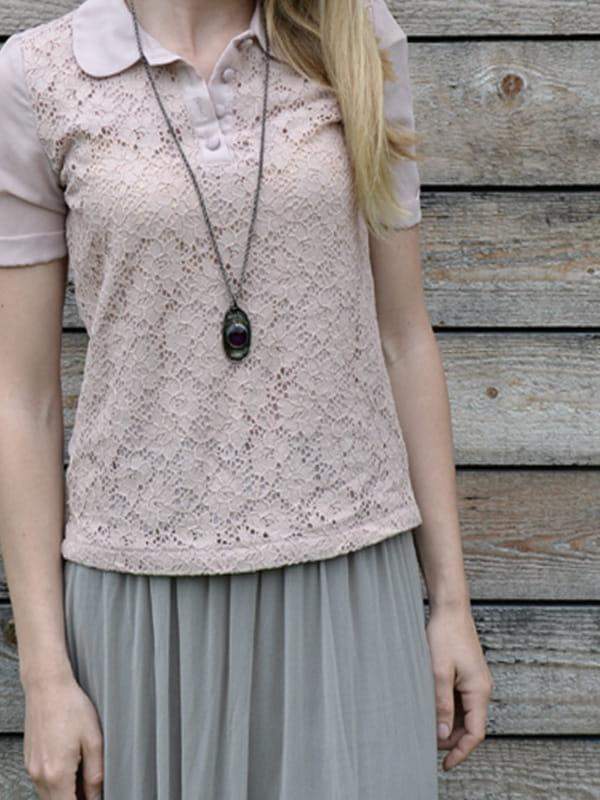 Rustykalny naszyjnik z fioletowym szkiełkiem.