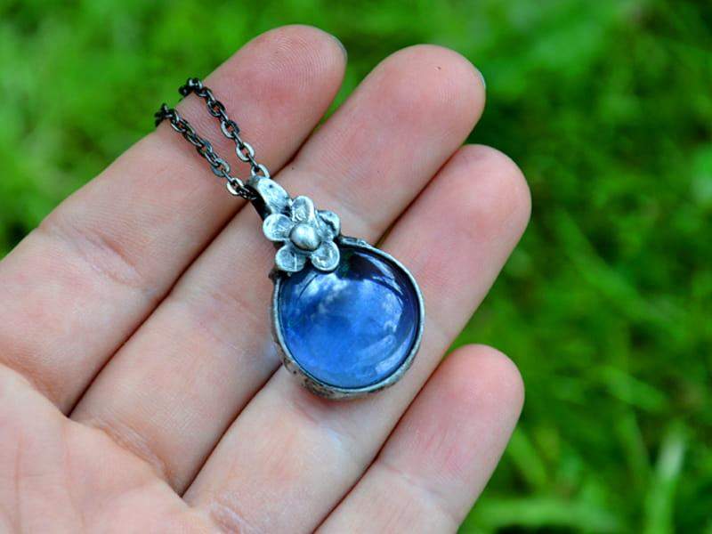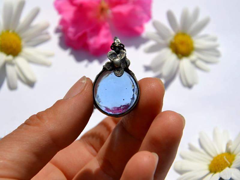 5. Naszyjnik z błękitnym szkiełkiem i kwiatuszkiem (oprawa w kolorze ciemnego srebra)