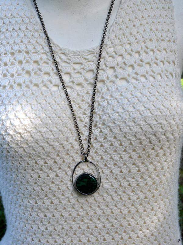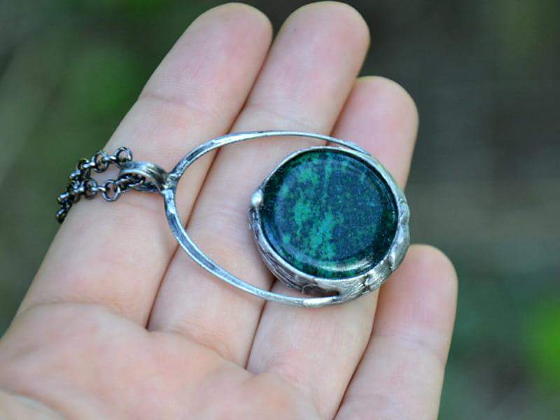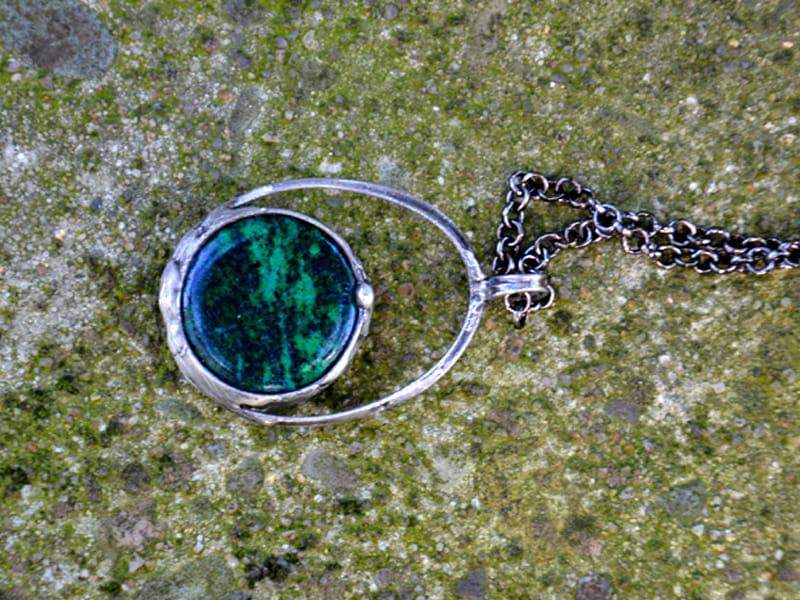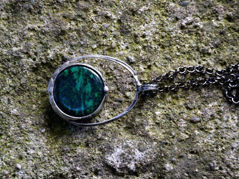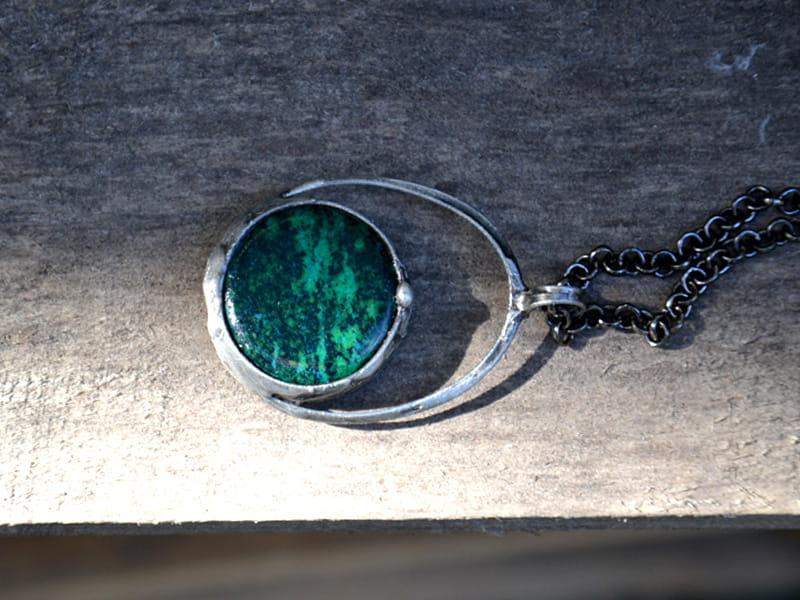 Naszyjnik z chryzokolą. Kamień naturalny o średnicy 2,5 cm oprawiłam w ekologiczną cynę stylizowaną na stare srebro. W komplecie długi łańcuch.