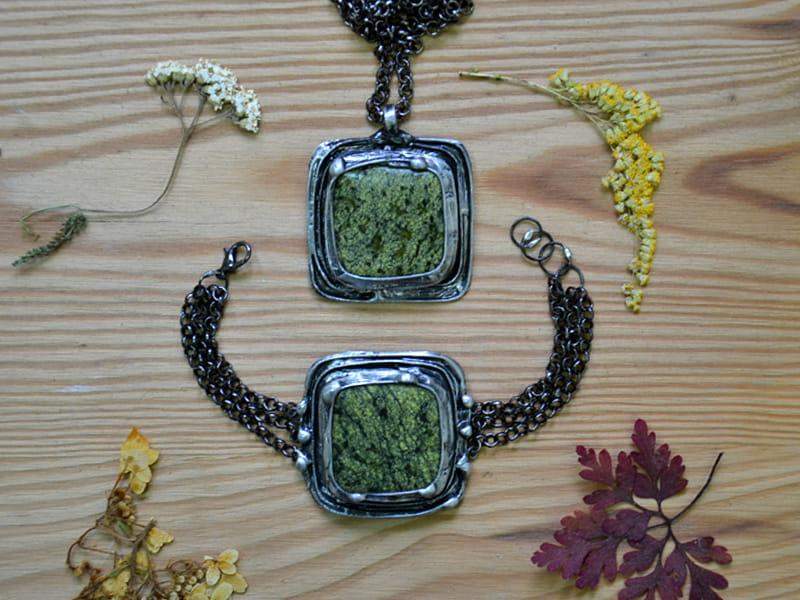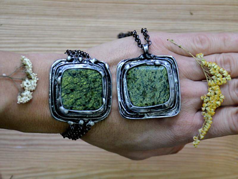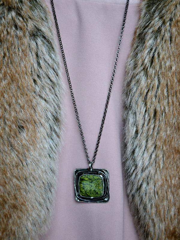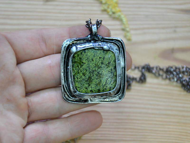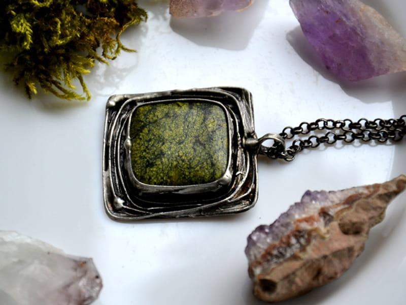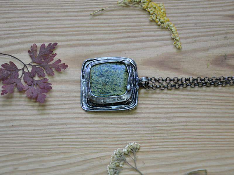 Unikatowy naszyjnik z jaspisem. Ozdobna oprawa wykonana z miedzi pokrytej ekologiczną cyną stylizowaną na stare srebro. Wymiary zawieszki to 5 x 5 cm. W komplecie długi łańcuszek. Biżuteria w 100% wykonana ręcznie, poszczególne sztuki mogą się minimalnie różnić.