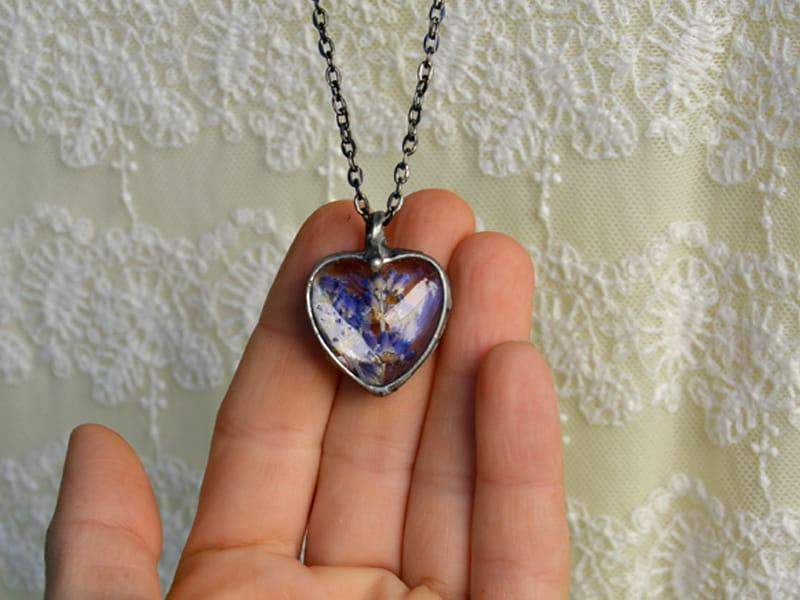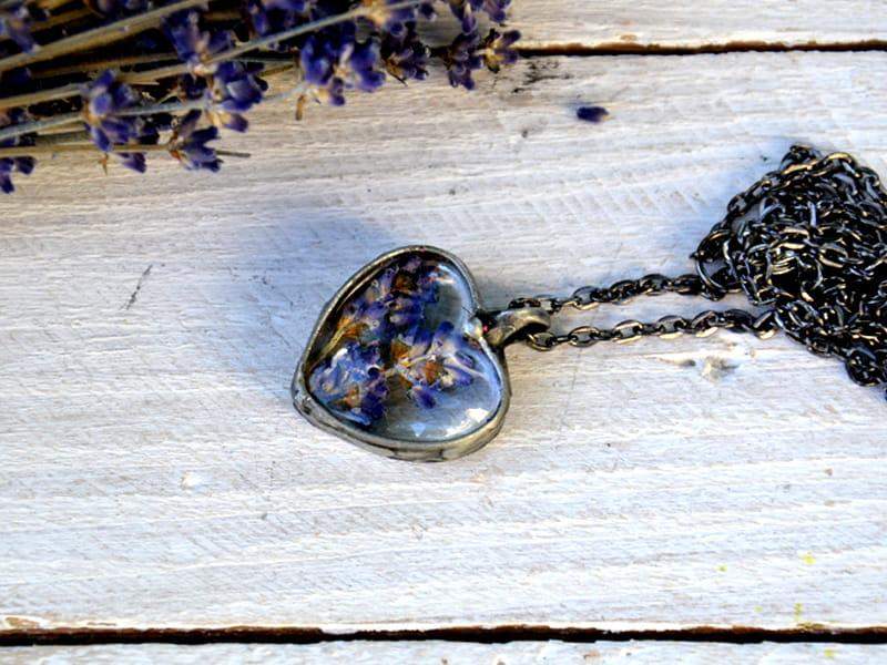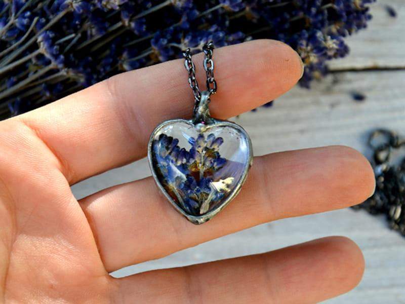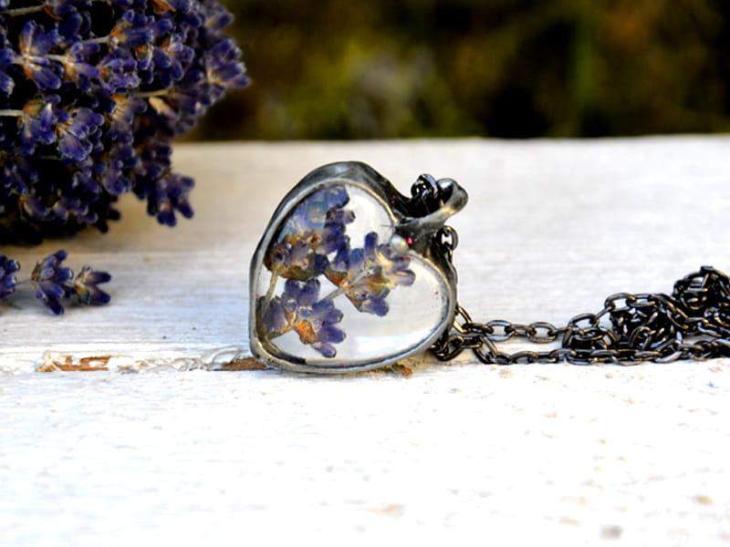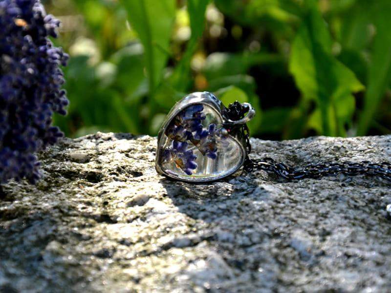 Romantyczny naszyjnik z zamkniętą w szkle lawendą.