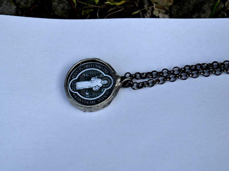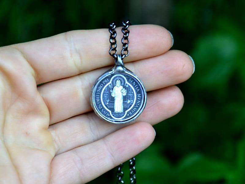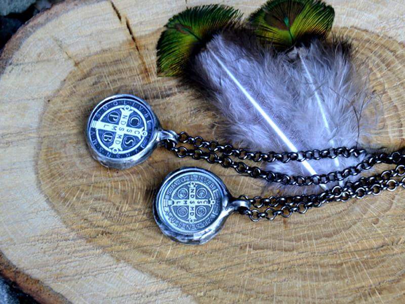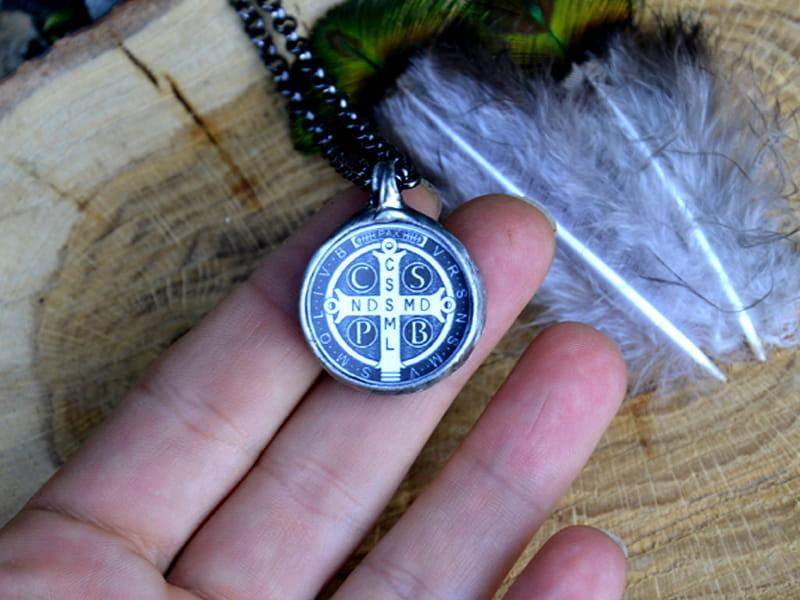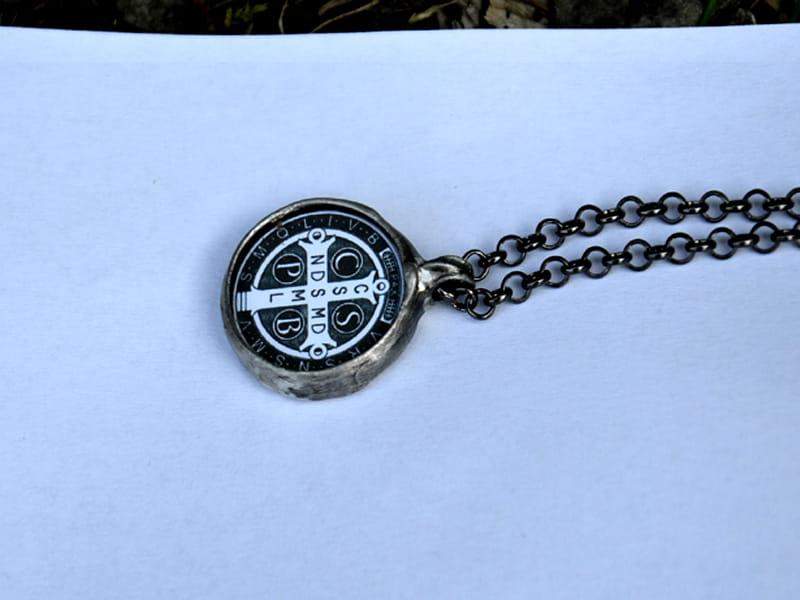 Naszyjnik z dwustronnym medalikiem benedyktyńskim. Czarno-biała grafika o średnicy 2,5 cm z wzorem rustykalnie oprawiona jest w ekologiczną cynę stylizowaną na ciemne srebro. Łańcuszek w kolorze ciemnego srebra o długości 50 cm. Biżuteria w 100% wykonana ręcznie, poszczególne sztuki mogą się minimalnie różnić