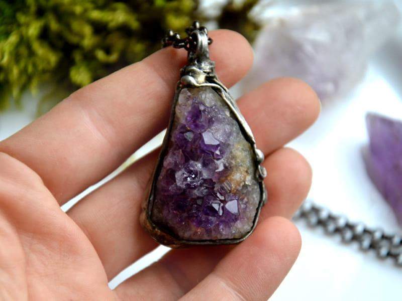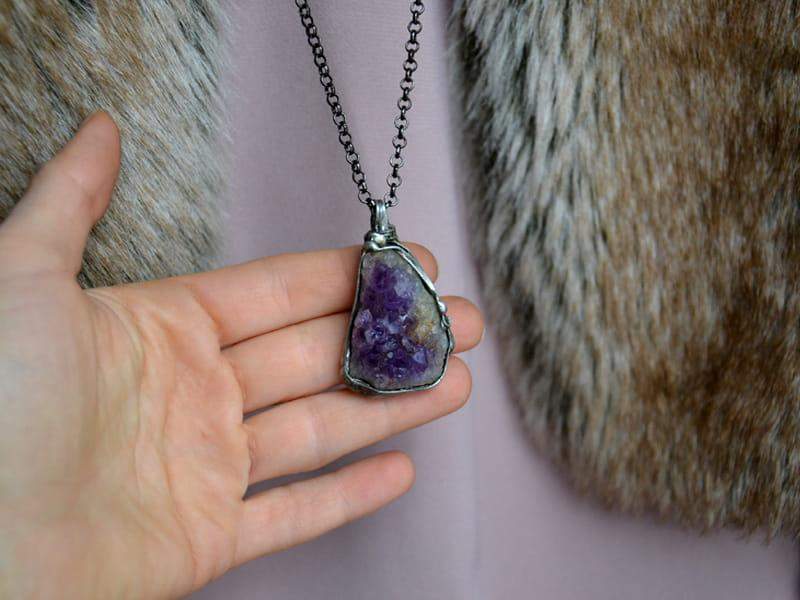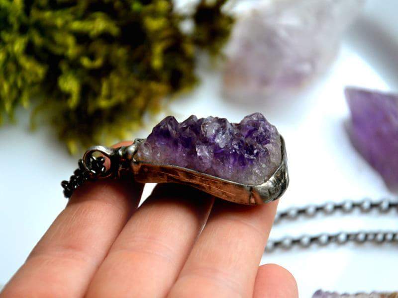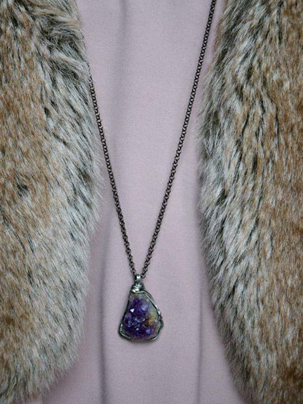 Unikatowy naszyjnik z surowym ametystem. Rustykalna oprawa wykonana z miedzi pokrytej ekologiczną cyną stylizowaną na stare srebro. Wymiary kamienia 2,5 x 4 cm. W komplecie długi łańcuszek.