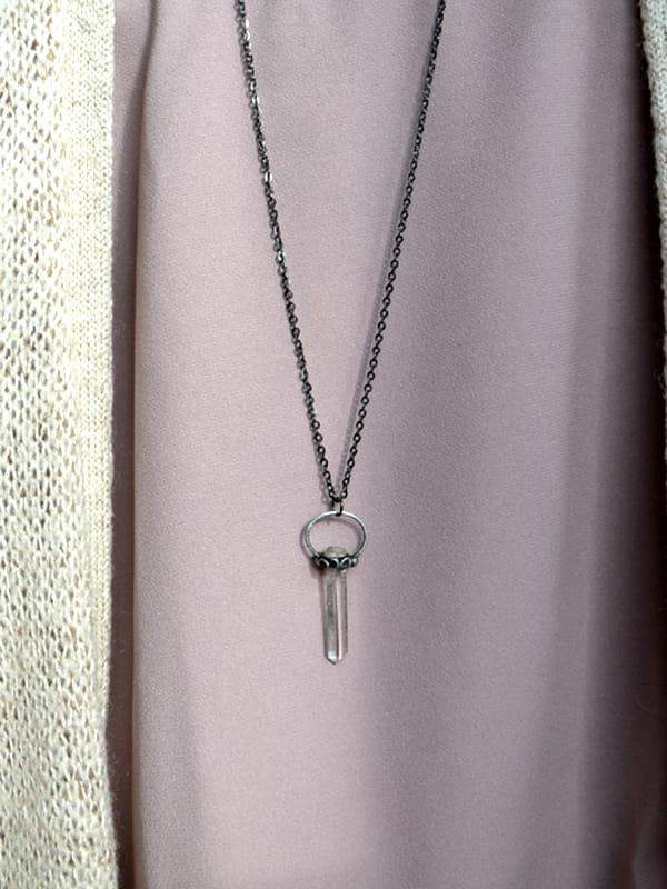 Niepowtarzalny naszyjnik z surowym kryształem górskim. Rustykalna oprawa wykonana z miedzi pokrytej ekologiczną cyną stylizowaną na stare srebro. Wymiary kamienia 4,5 x 0,7 x 0,5 cm. W komplecie długi łańcuszek.