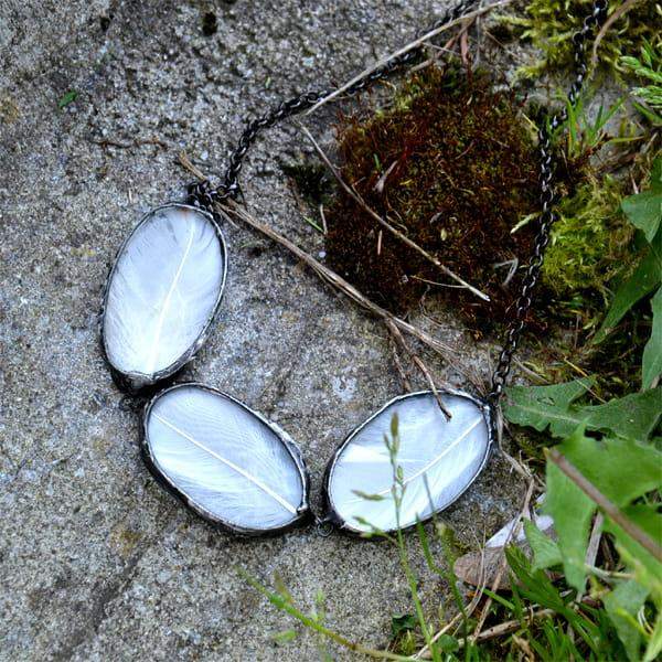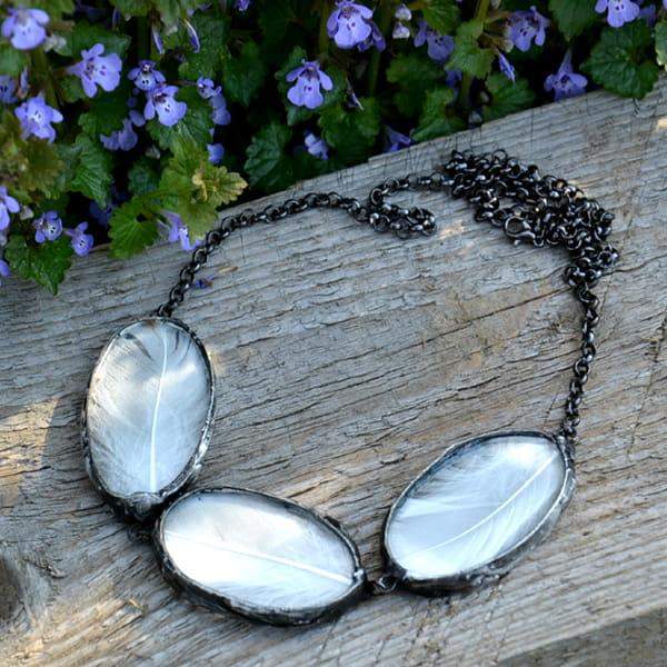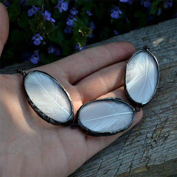 Bardzo efektowny naszyjnik z prawdziwymi piórkami zamkniętymi w szkle. Wymiary pojedynczego szkła z piórkiem to ok. 3 x 4 cm. Oprawa wisiora i łańcuszek w kolorze starego srebra. Obwód naszyjnika to 50 cm plus 5cm regulacji. Biżuteria w 100% wykonana ręcznie, poszczególne sztuki mogą się minimalnie różnić.