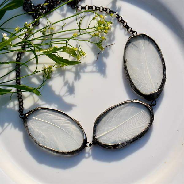 Bardzo efektowny naszyjnik z prawdziwymi piórkami zamkniętymi w szkle.