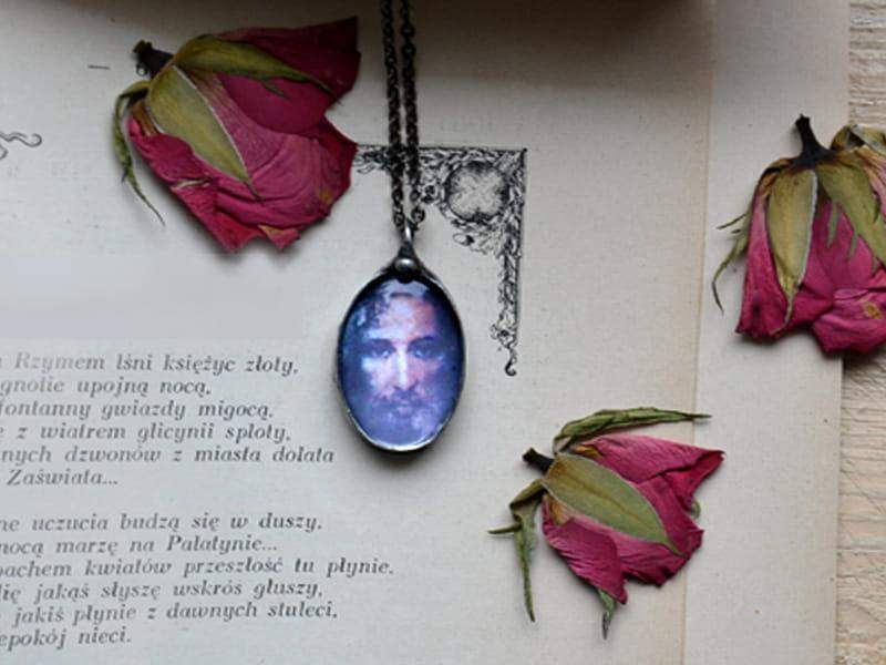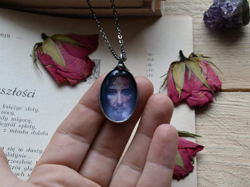 Naszyjnik z wizerunkiem Pana Jezusa. Rustykalna oprawa wykonana z ekologicznej cyny stylizowanej na stare srebro. Wymiary wisiora to ok. 3 x 4 cm. Długi łańcuszek w kolorze starego srebra. Biżuteria w 100% wykonana ręcznie, poszczególne sztuki mogą się minimalnie różnić