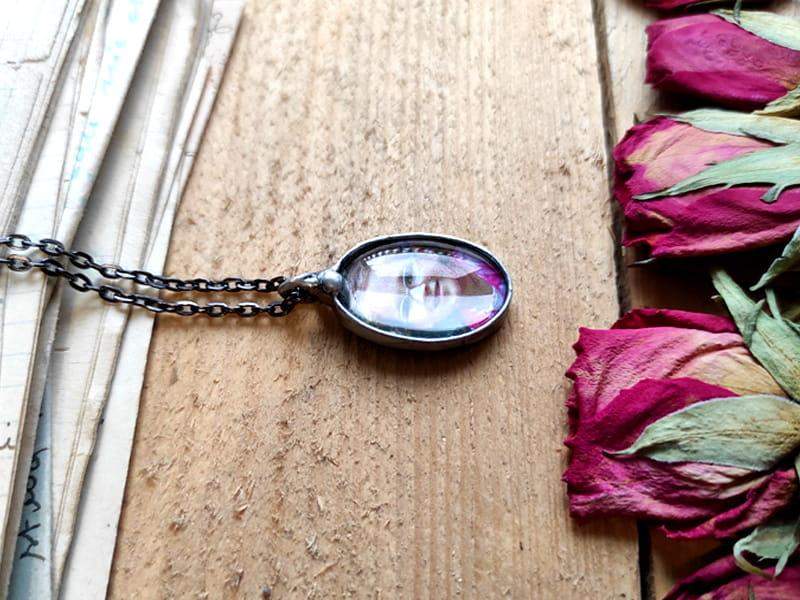 Naszyjnik z dowolnym zdjęciem lub grafiką zamkniętą wewnątrz. Rustykalna oprawa wykonana z ekologicznej cyny stylizowanej na kolor srebrny lub kolor ciemnego srebra. Wymiary wisiora to ok. 2,5 x 3,5 cm. Łańcuszek o długości 50cm w kolorze dopasowanym do oprawy. Biżuteria w 100% wykonana ręcznie, poszczególne sztuki mogą się minimalnie różnić