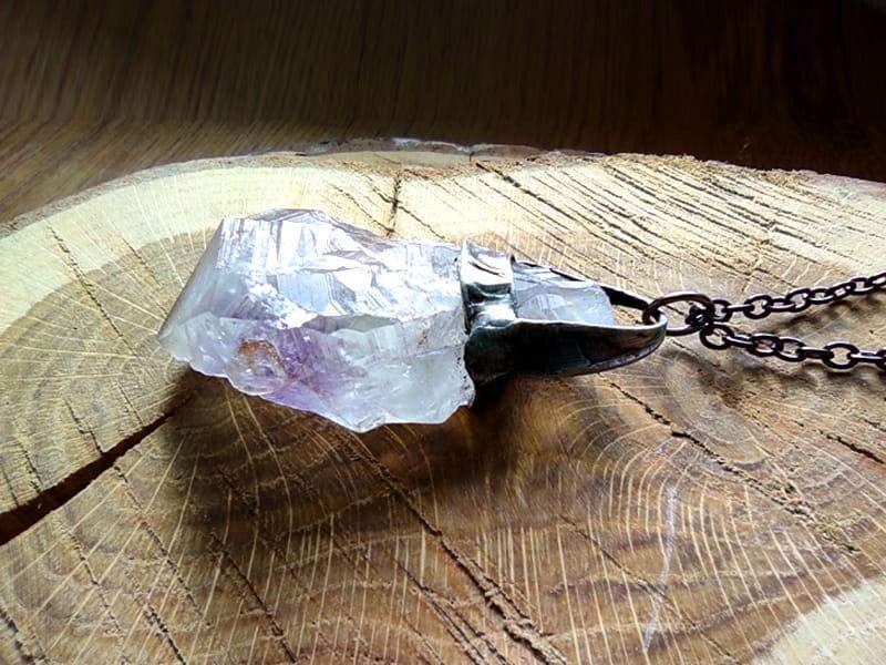 Unikatowy naszyjnik z surowym ametystem. Rustykalna oprawa wykonana z miedzi pokrytej ekologiczną cyną stylizowaną na stare srebro. Wymiary kamienia 5 x 3 x 2 cm. W komplecie długi łańcuszek.
