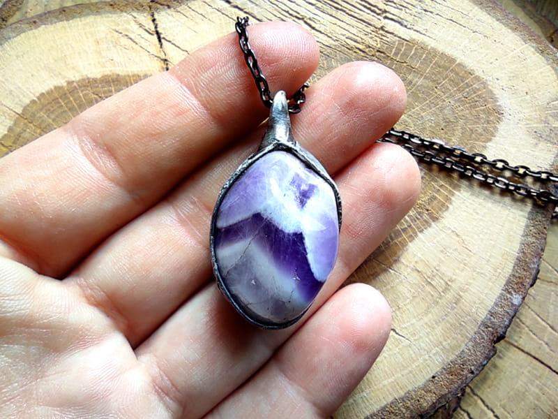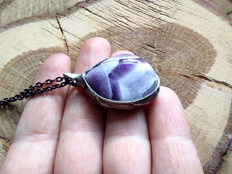Unikatowy naszyjnik z surowym ametystem. Rustykalna oprawa wykonana z miedzi pokrytej ekologiczną cyną stylizowaną na stare srebro. Wymiary kamienia 3 x 2 cm. W komplecie długi łańcuszek.