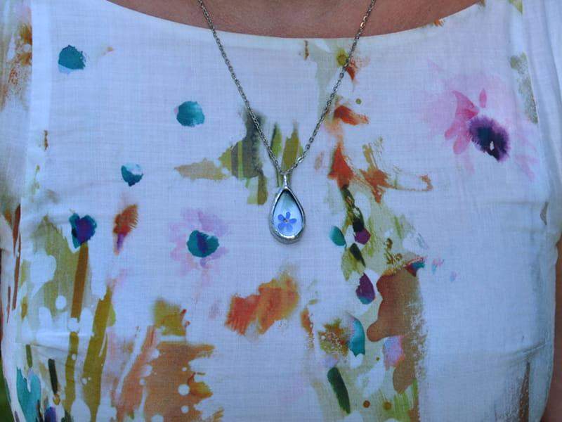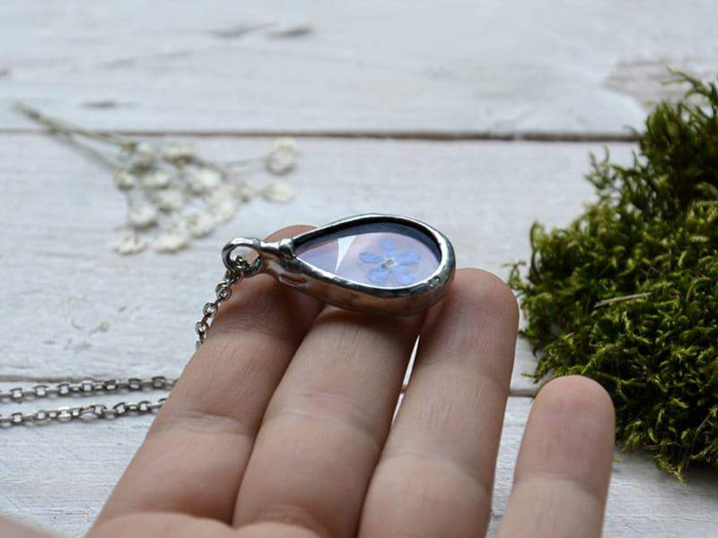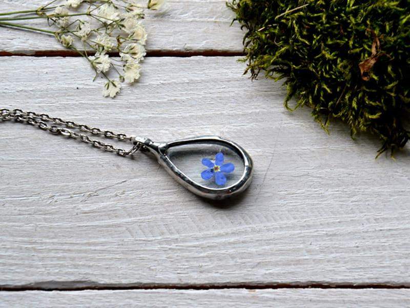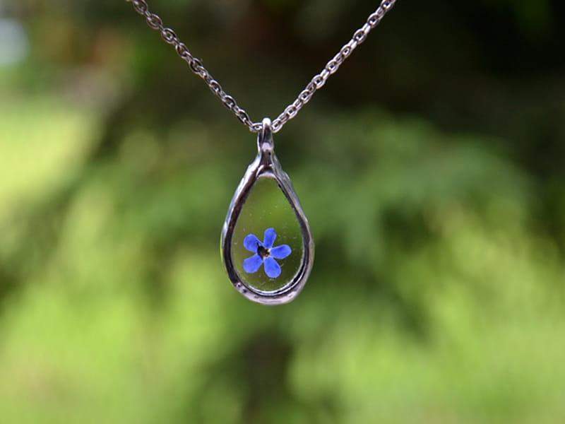 Romantyczny naszyjnik z zamkniętymi w szkle niezapominajkami.