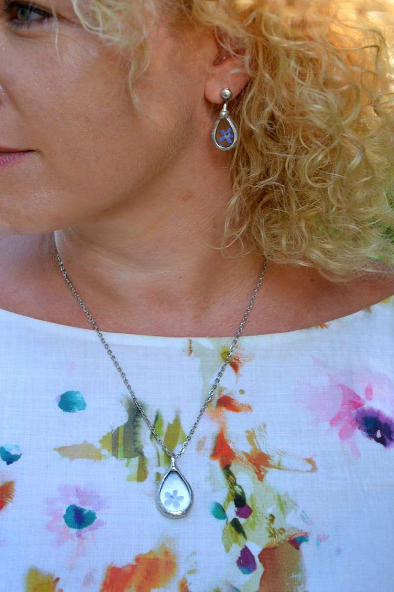Romantyczny naszyjnik z zamkniętymi w szkle niezapominajkami. Wymiary wisiorka to ok. 2 x 3 cm. Oprawa w kolorze srebrnym. Łańcuszek o długości 50 cm. Biżuteria w 100% wykonana ręcznie, poszczególne sztuki mogą się minimalnie różnić.