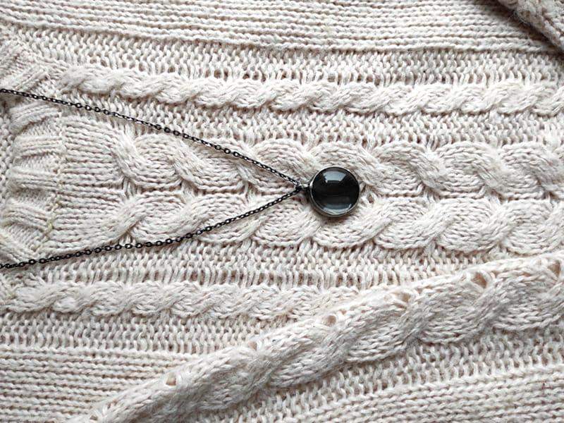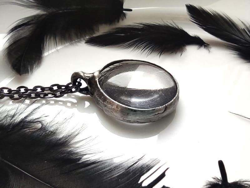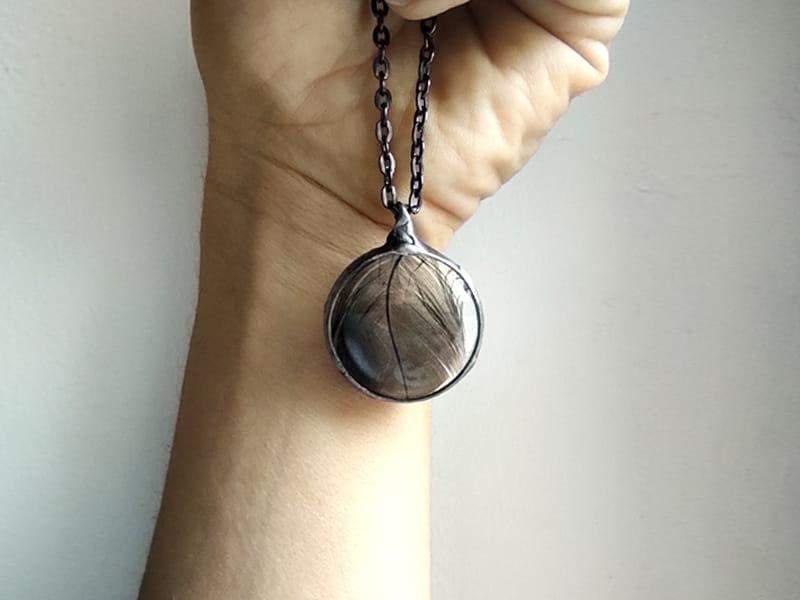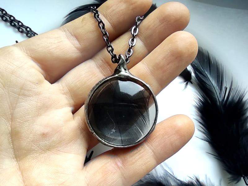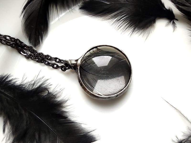 Intrygujący naszyjnik z czarnym piórkiem. Średnica wisiora to ok. 3 cm. Oprawa i łańcuszek w kolorze ciemnego srebra. Wisiorek zawieszony na długim łańcuszku. Biżuteria w 100% wykonana ręcznie, poszczególne sztuki mogą się minimalnie różnić.