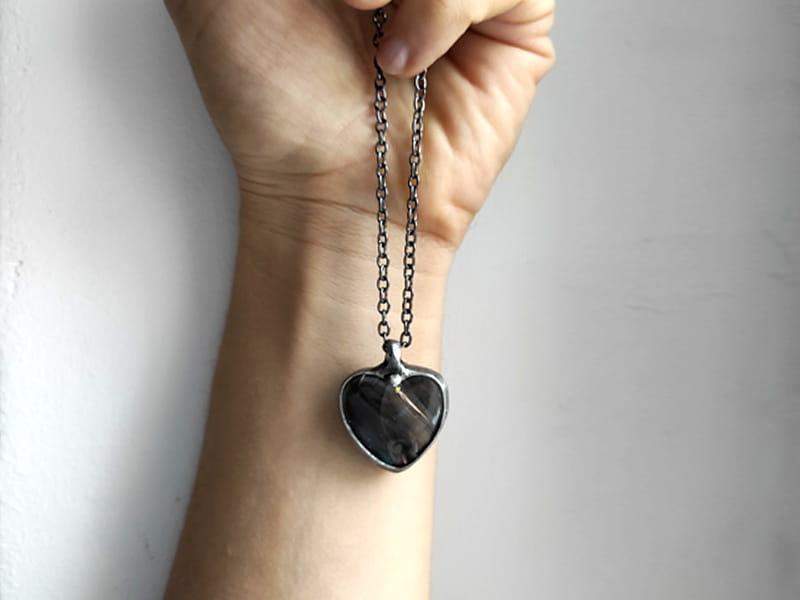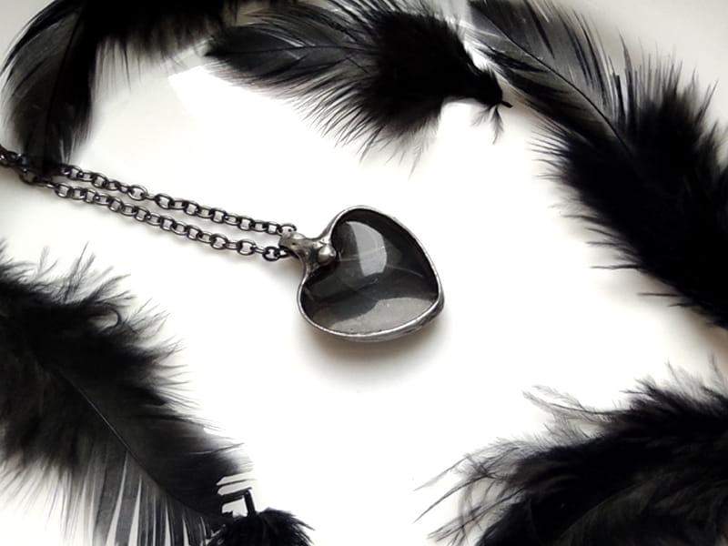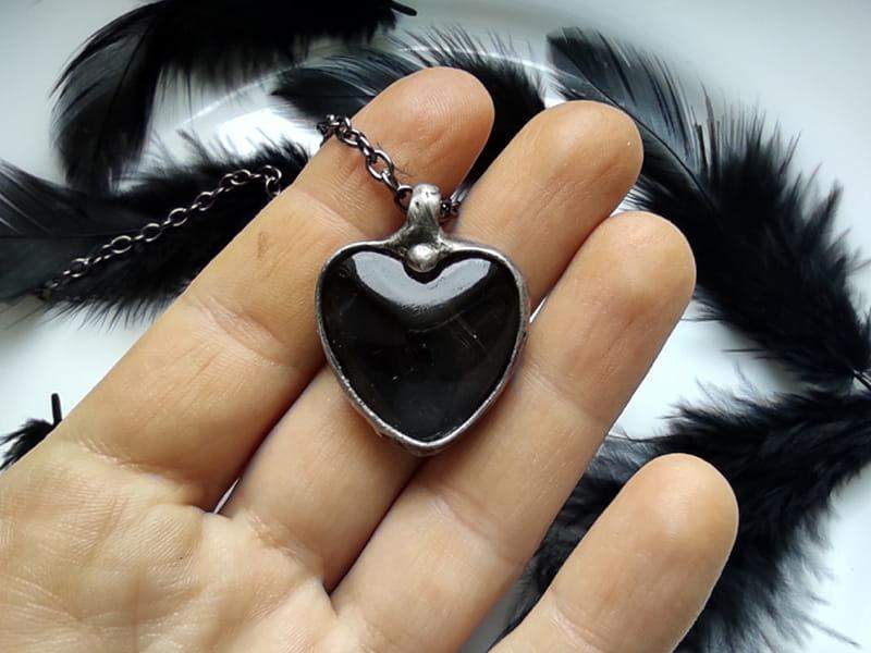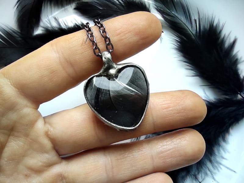 Intrygujący naszyjnik z czarnym piórkiem. Szklane serduszko ma wymiary 3 x 3 cm. Oprawa i łańcuszek w kolorze ciemnego srebra. Wisiorek zawieszony na długim łańcuszku. Biżuteria w 100% wykonana ręcznie, poszczególne sztuki mogą się minimalnie różnić.