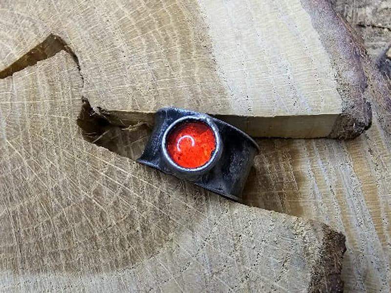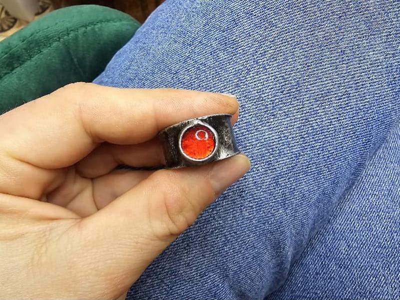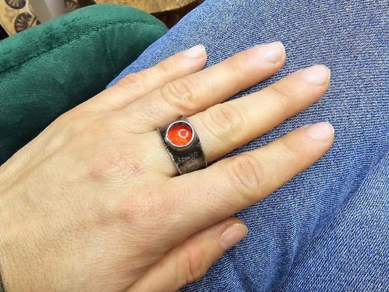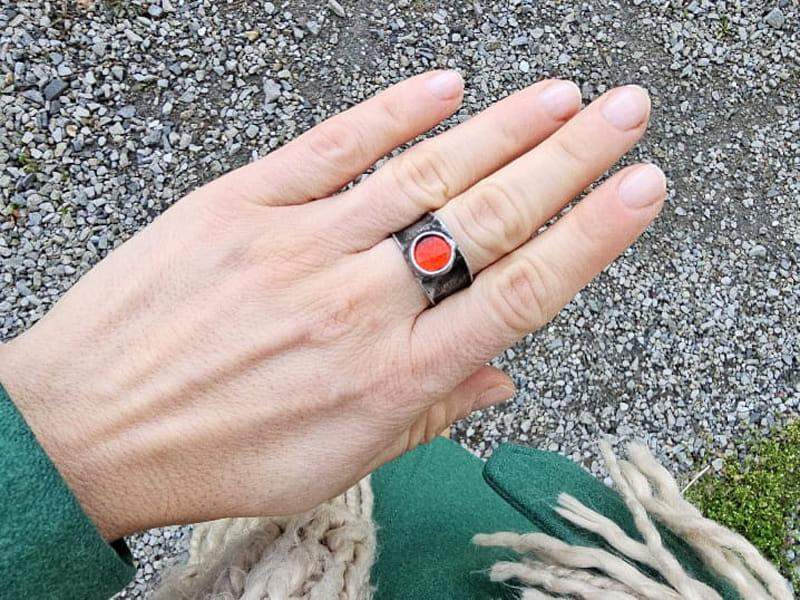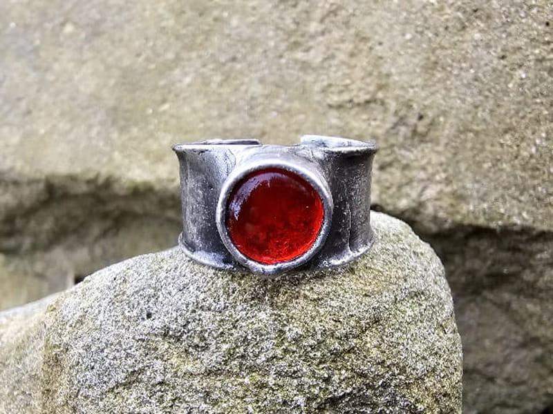 Pierścionek w formie obrączki z czerwonym szklanym oczkiem. Szkiełko jest wykonane w technice fusingu w naszej pracowni. Dzięki wysokiej temperaturze, w jakiej zostało wypalone, brzegi szkła są zaokrąglone, a kolor niezmywalny.
