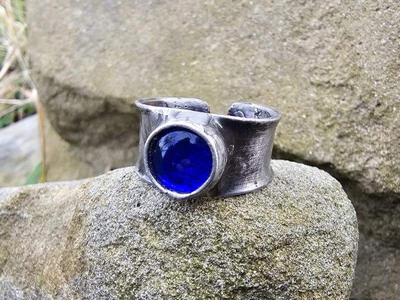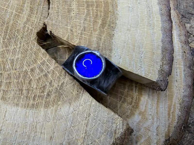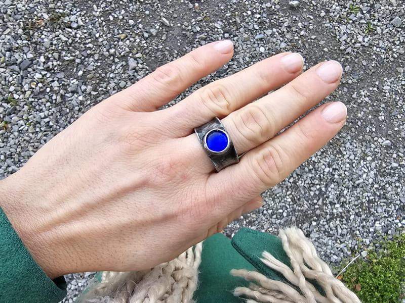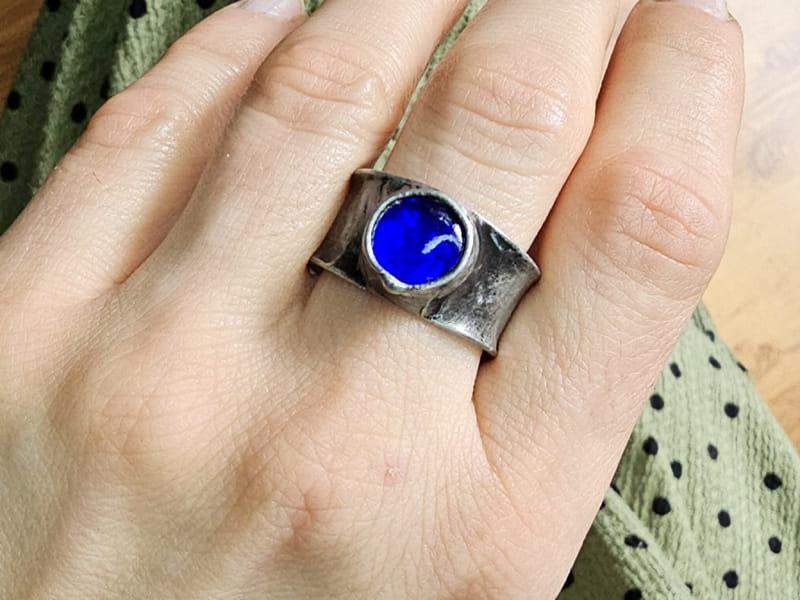 Pierścionek w formie obrączki z szafirowym szklanym oczkiem. Szkiełko jest wykonane w technice fusingu w naszej pracowni. Dzięki wysokiej temperaturze, w jakiej zostało wypalone, brzegi szkła są zaokrąglone, a kolor niezmywalny.