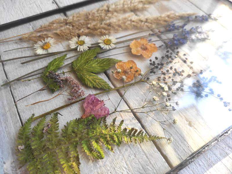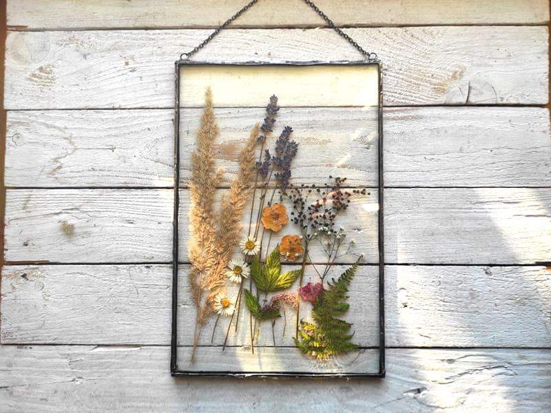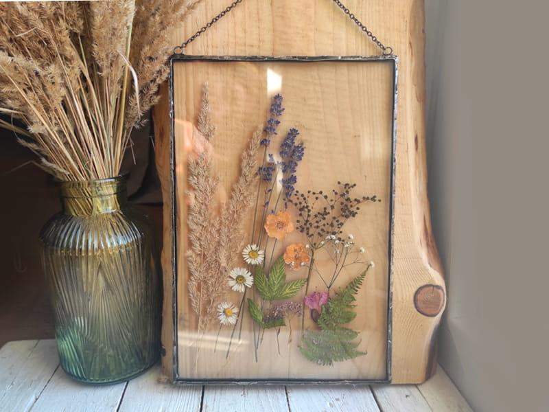 Duży szklany obraz z suszonymi kwiatami.