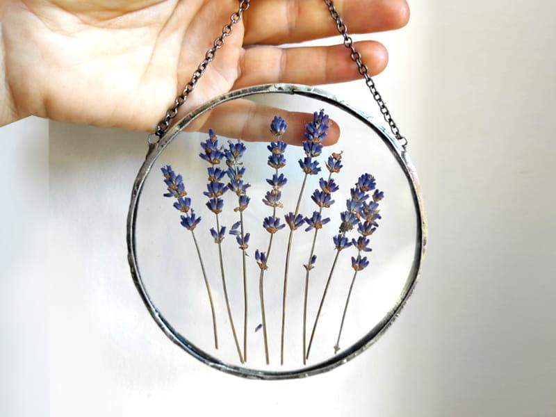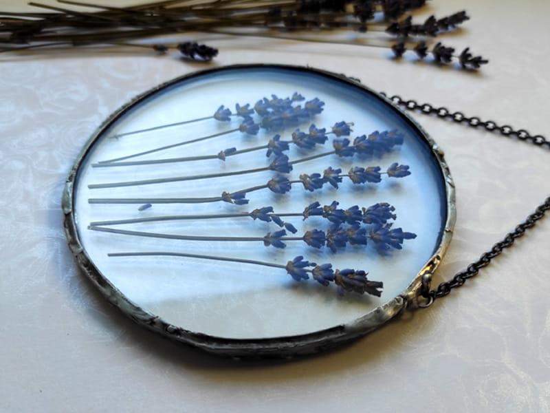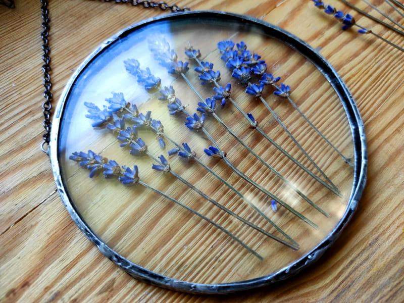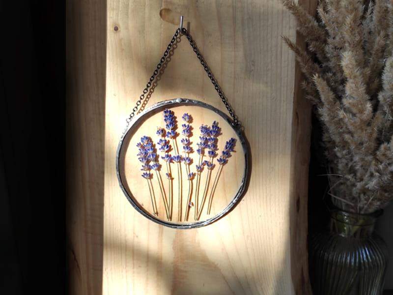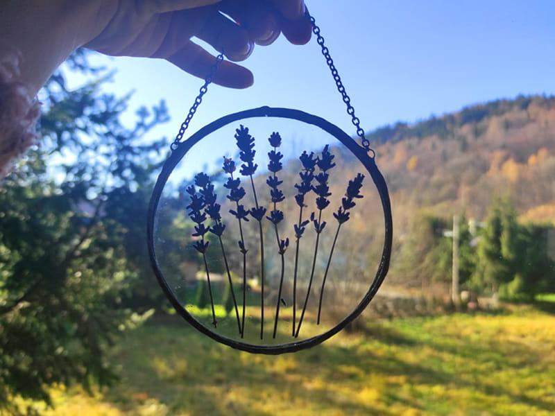 Kompozycja została wykonana z zasuszonych roślin oraz szkła oprawionego metodą witrażową. Całość zawieszona na łańcuszku.