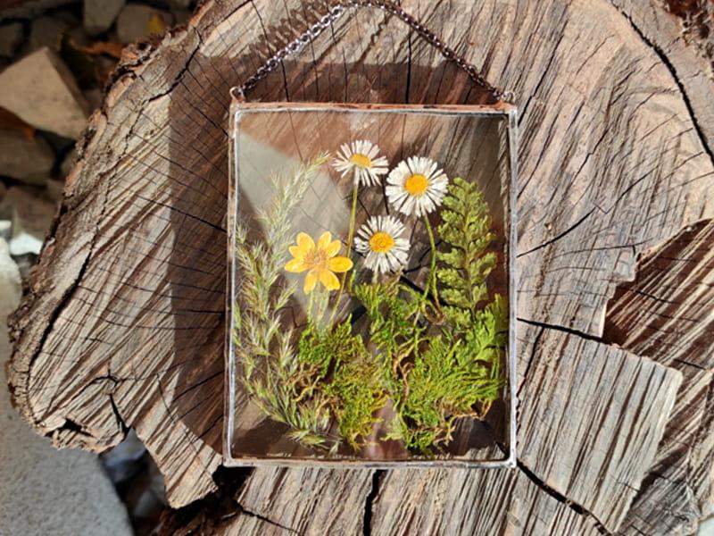 Kompozycja została wykonana z zasuszonych roślin oraz szkła oprawionego metodą witrażową. Całość zawieszona na łańcuszku.