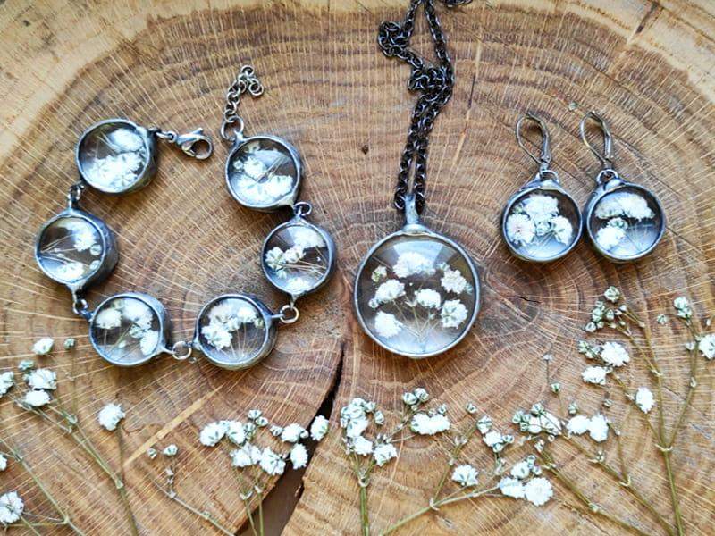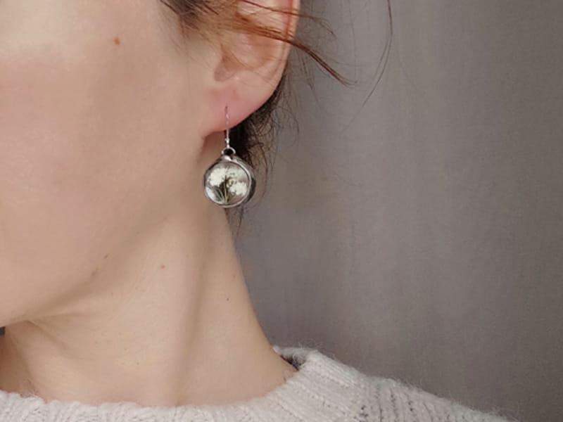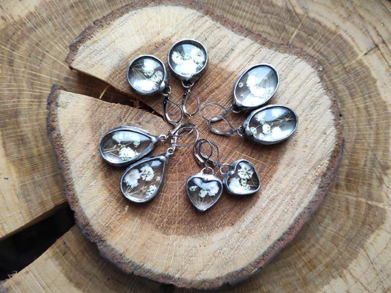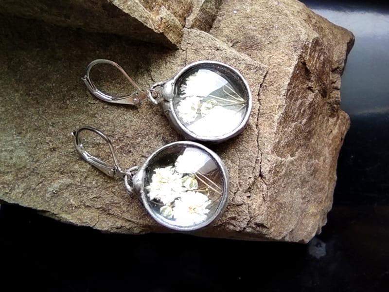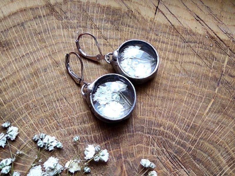 Romantyczne kolczyki z gipsówką zamkniętą w szkle. Oprawa wykonana z ekologicznej cyny stylizowanej na stare srebro. Zamykane antyalergiczne bigle. Długość kolczyka to ok. 3,5 cm. Biżuteria w 100% wykonana ręcznie, poszczególne sztuki mogą się minimalnie różnić.