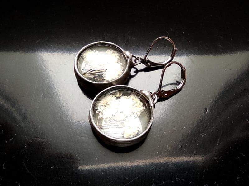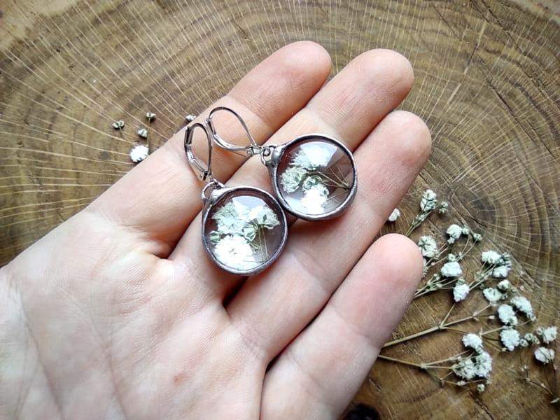 Romantyczne kolczyki z kwiatami zamkniętymi w szkle.