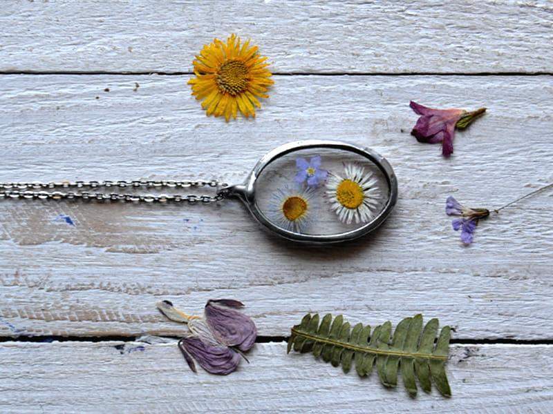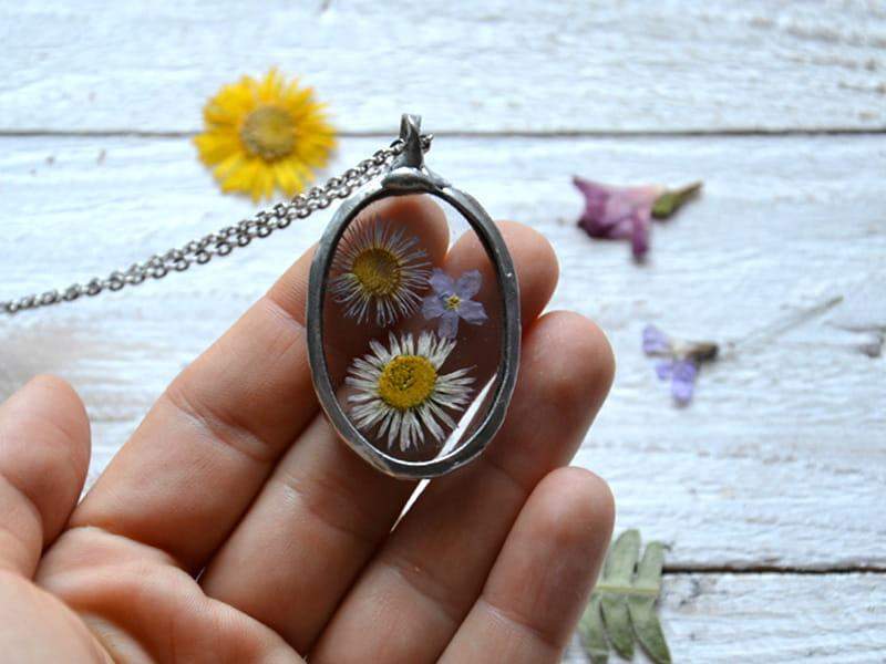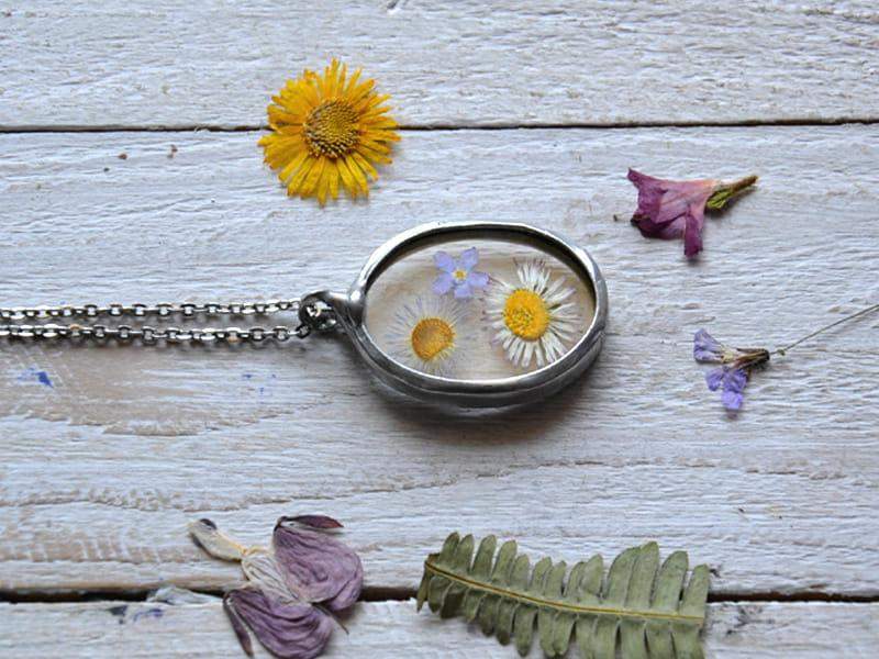 Subtelny naszyjnik z kwiatuszkami zamkniętymi w szkle. Oprawa wykonana z ekologicznej cyny w kolorze srebrnym. Wymiary wisiora to ok. 4 x 3 cm. W komplecie długi łańcuszek. Biżuteria wykonana ręcznie, poszczególne egzemplarze mogą nieznacznie się między sobą różnić.