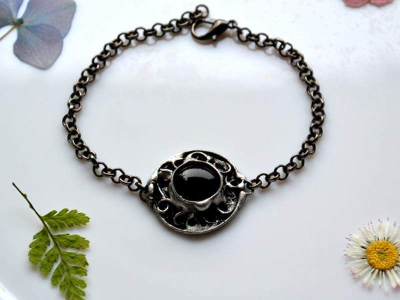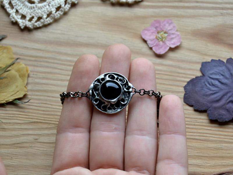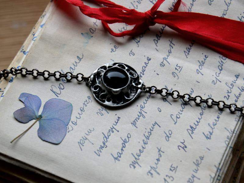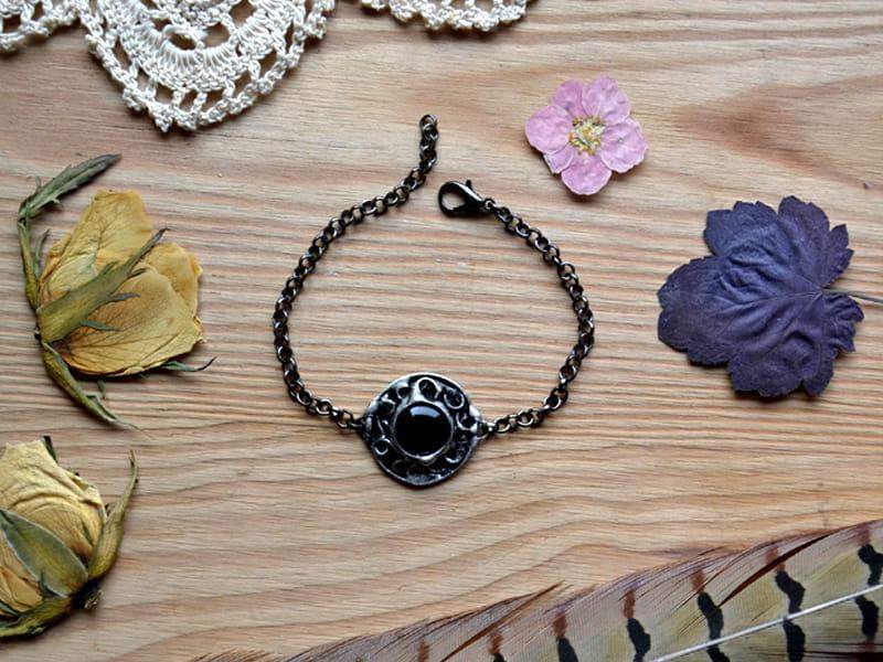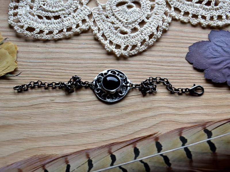 Unikatowa, rustykalna bransoletka. Oprawa wykonana z miedzi pokrytej ekologiczną cyną stylizowaną na stare srebro. Średnica oczka to ok. 2 cm. Obwód bransoletki to 18 cm + 3 cm regulacji. Chętnie wykonam ją w innym rozmiarze. Biżuteria w 100% wykonana ręcznie, poszczególne sztuki mogą się minimalnie różnić.