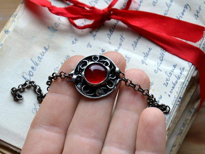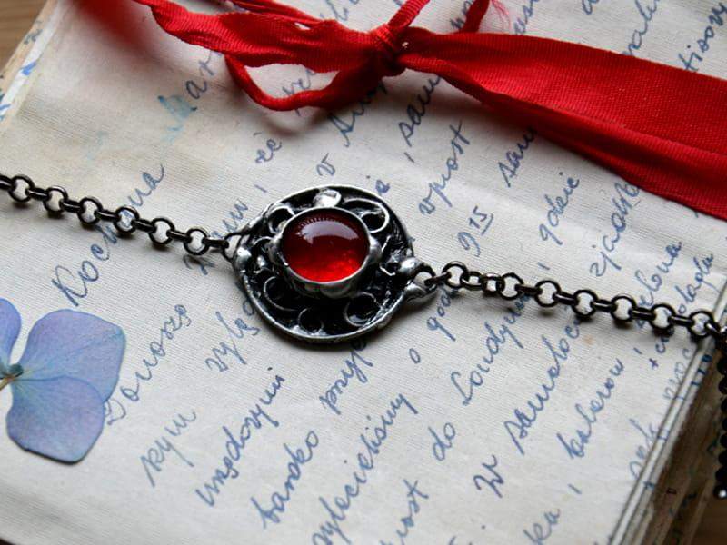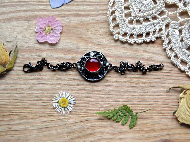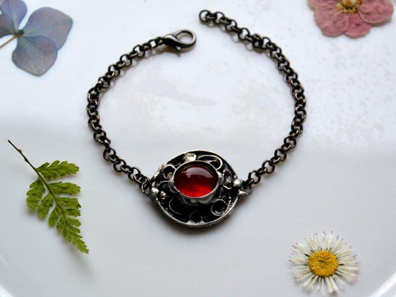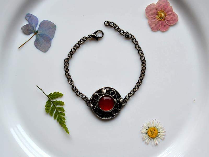 Unikatowa, rustykalna bransoletka. Oprawa wykonana z miedzi pokrytej ekologiczną cyną stylizowaną na stare srebro. Średnica oczka to ok. 2 cm. Obwód bransoletki to 18 cm + 3 cm regulacji. Chętnie wykonam ją w innym rozmiarze. Biżuteria w 100% wykonana ręcznie, poszczególne sztuki mogą się minimalnie różnić