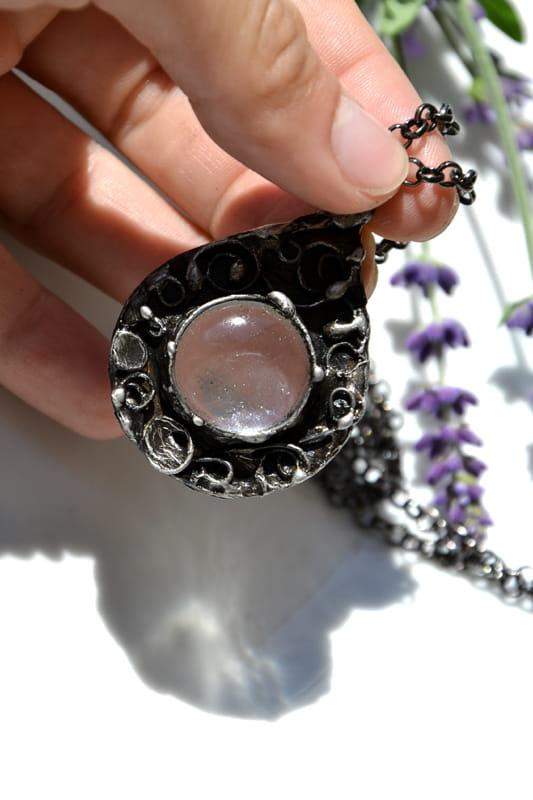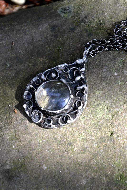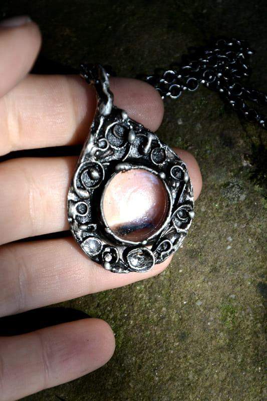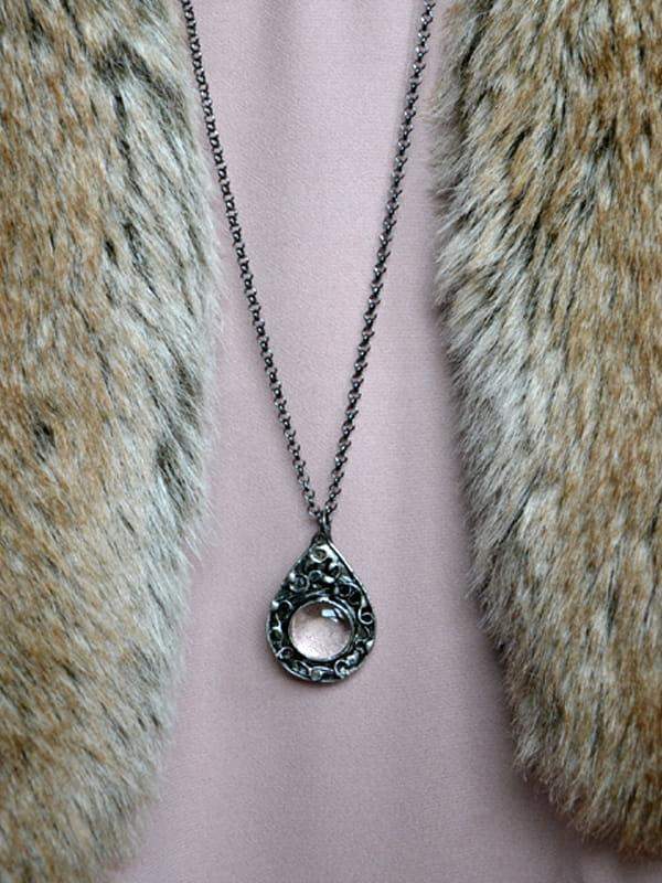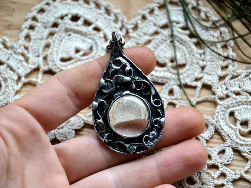 Delikatny naszyjnik z misternym, ornamentalnym wzorkiem. Wykonany jest ze szkła oprawionego w ekologiczną cynę. Oprawa stylizowana jest na stare srebro. Do wisiora dołączony jest łańcuszek o długości 80cm z możliwością regulacji. Wymiary wisiorka to 5 cm x 4 cm. Biżuteria w 100% wykonana ręcznie, poszczególne sztuki mogą się minimalnie różnić.