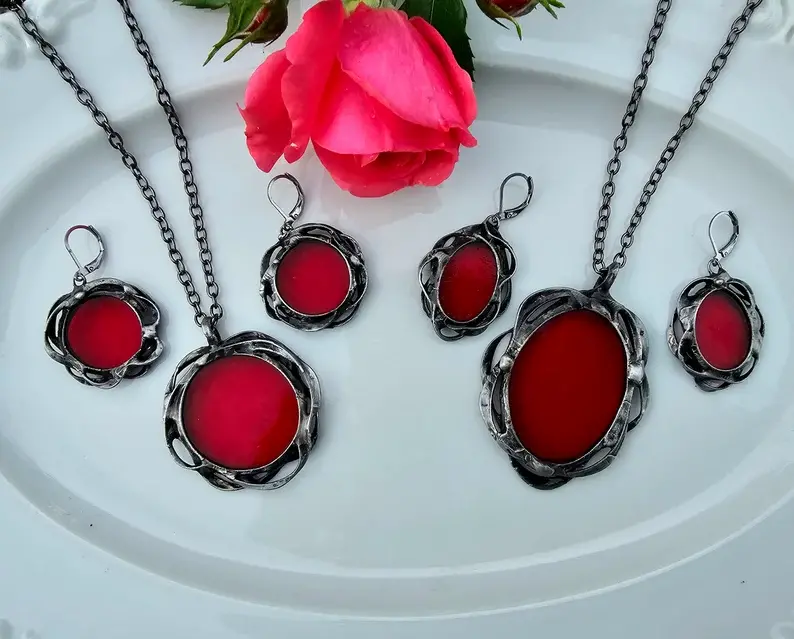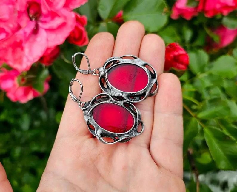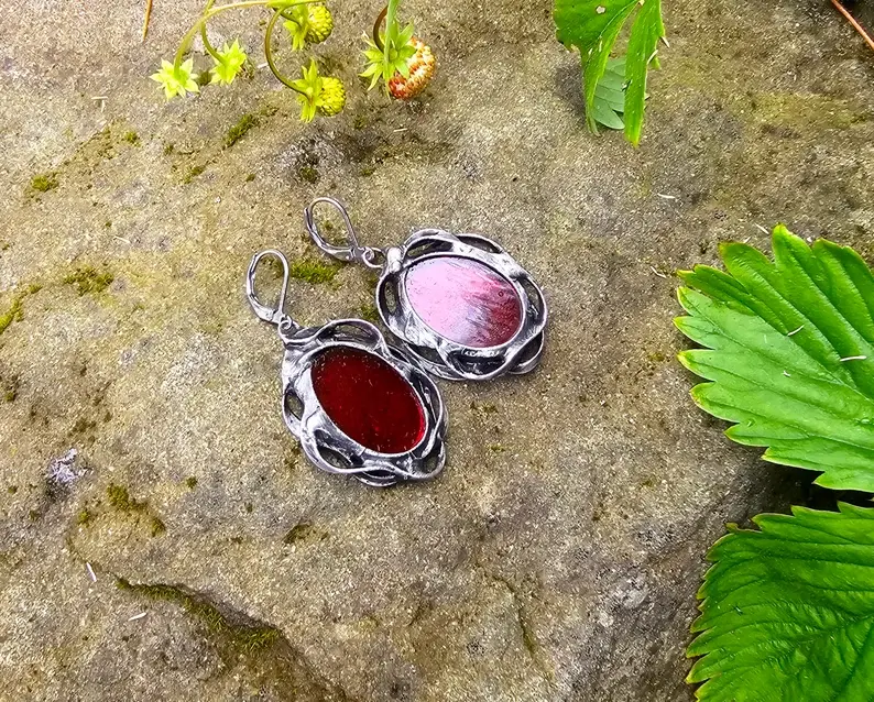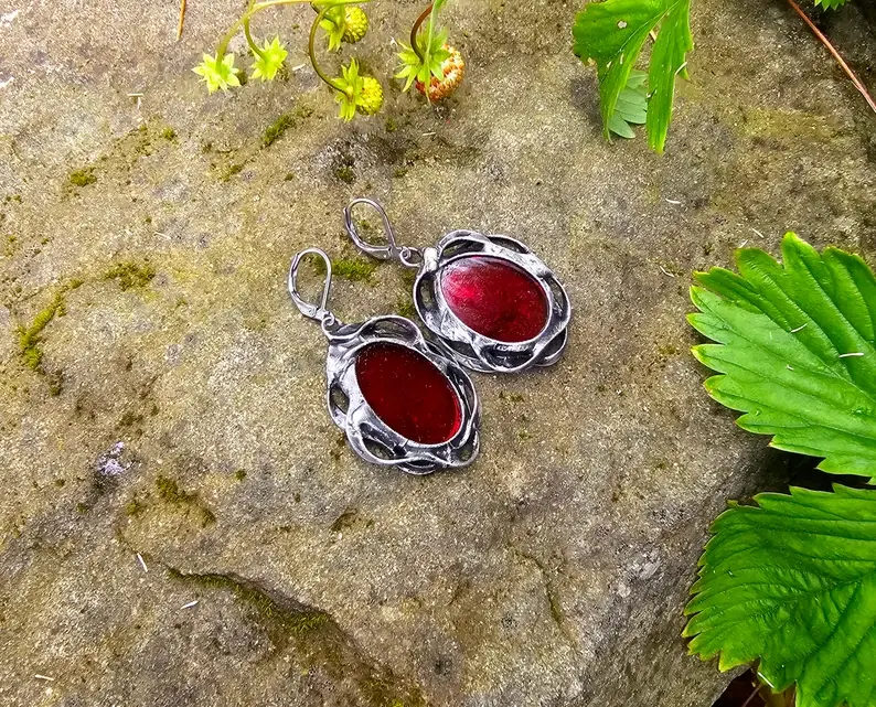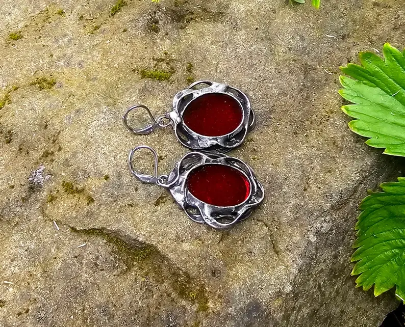 Efektowne, dekoracyjne kolczyki ze szkłem w głębokim czerwonym kolorze w ornamentalnej oprawie Projekt wykorzystuje elementy metaloplastyki połączone z wytopionym przeze mnie szkiełkiem.