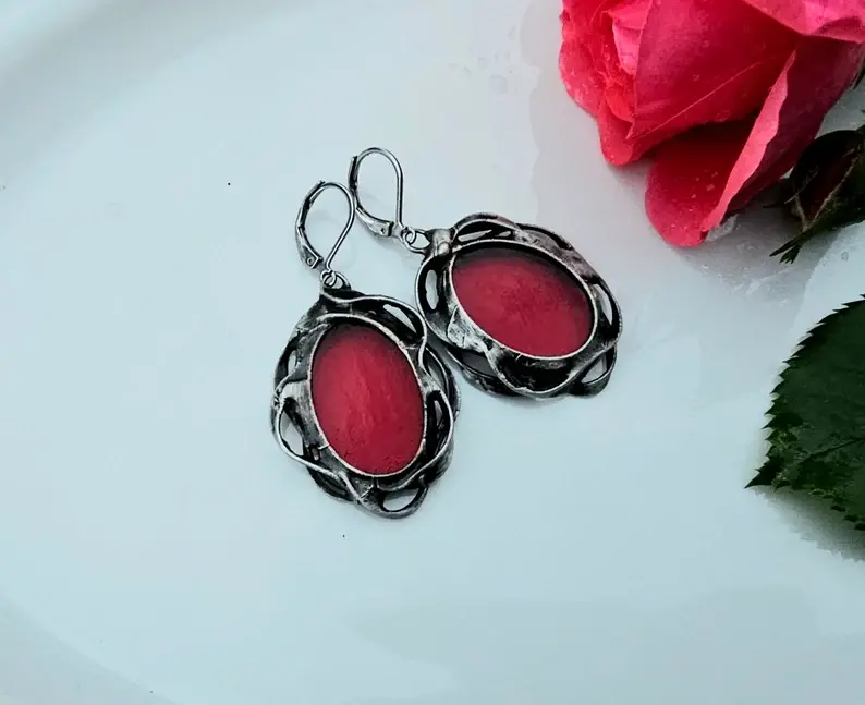 Ornamentalne, owalne kolczyki ze szkłem w czerwonym kolorze
