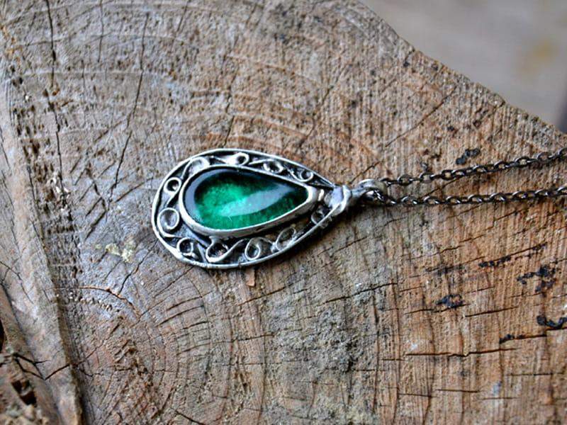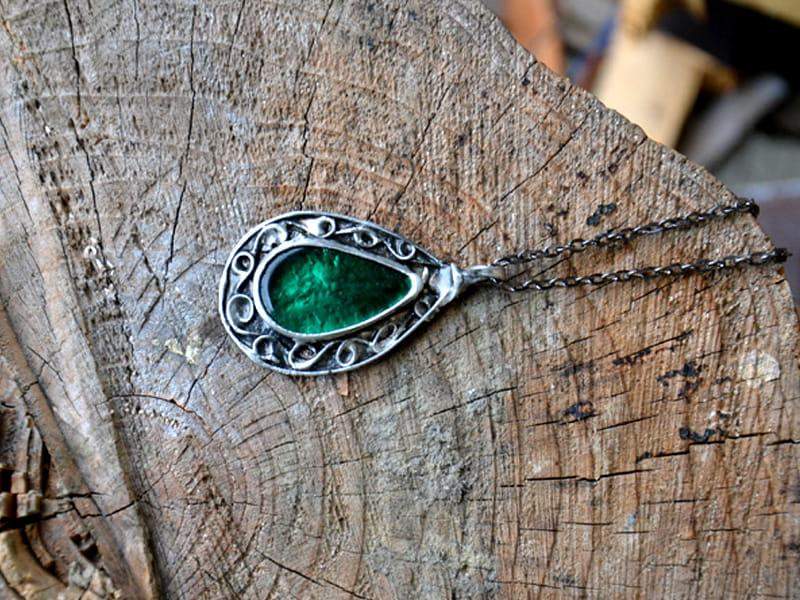 Dekoracyjny naszyjnik z zielonym szkłem.