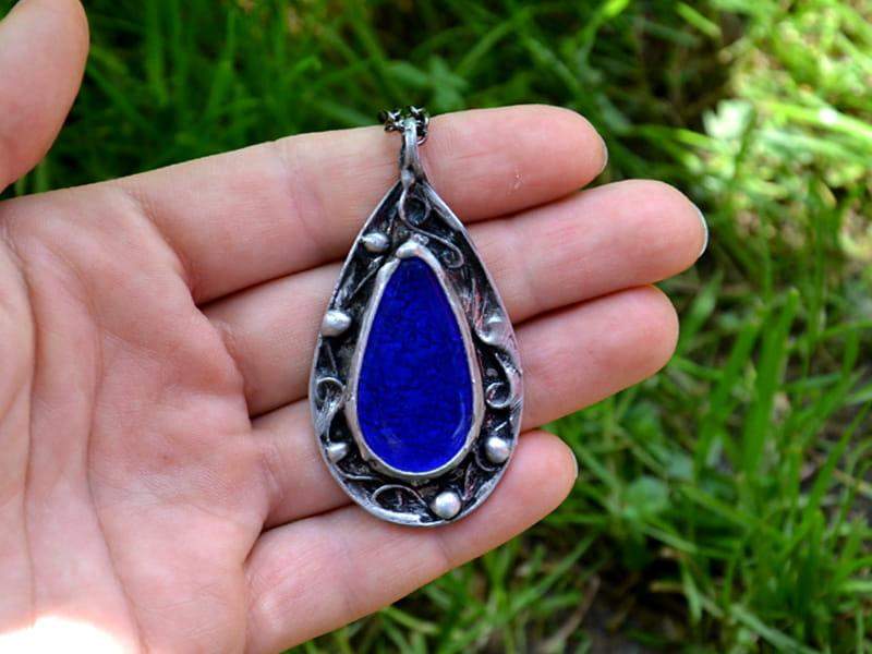 Dekoracyjny naszyjnik z wytopionym szkiełkiem oprawionym w ekologiczną cynę stylizowaną na stare srebro. Wymiary wisiora to ok. 3,5 x 5 cm. W komplecie długi łańcuch. Biżuteria w 100% wykonana ręcznie, poszczególne sztuki mogą się minimalnie różnić.