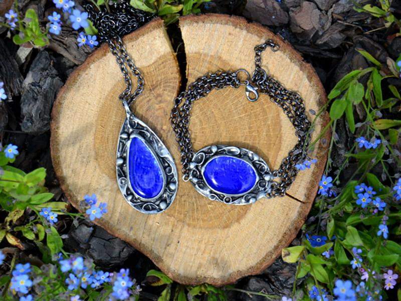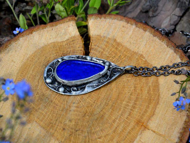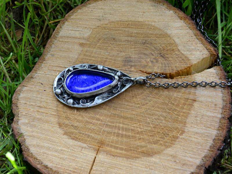 Dekoracyjny naszyjnik z szafirowym szkłem.
