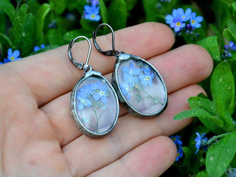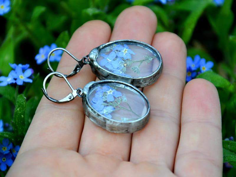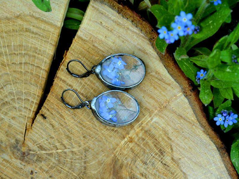 Romantyczne kolczyki z niezapominajkami zamkniętymi w szkle.