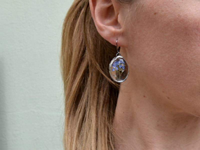 Romantyczne kolczyki z niezapominajkami zamkniętymi w szkle. Oprawa wykonana z ekologicznej cyny stylizowanej na stare srebro. Zamykane antyalergiczne bigle. Długość kolczyka to ok. 4,5 cm. Biżuteria w 100% wykonana ręcznie, poszczególne sztuki mogą się minimalnie różnić.