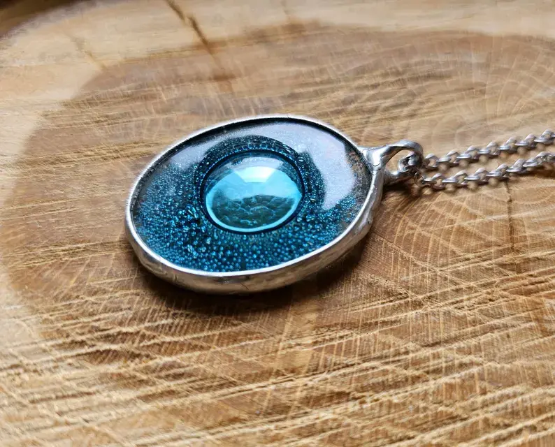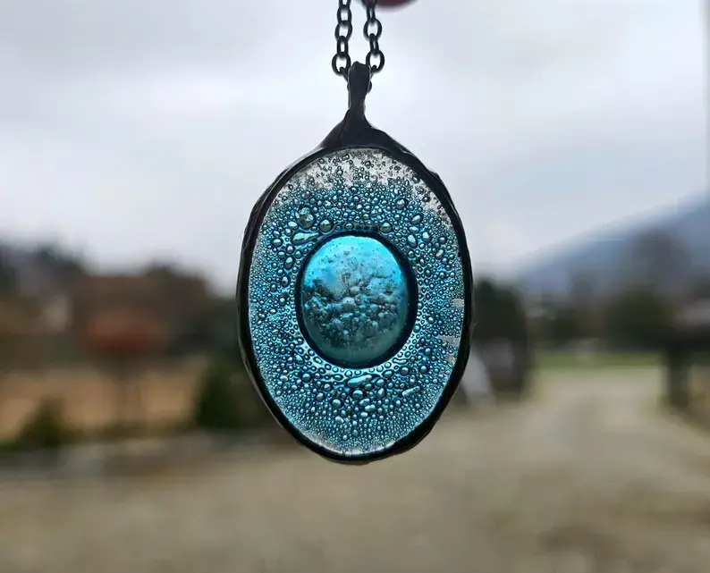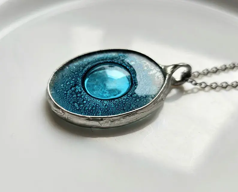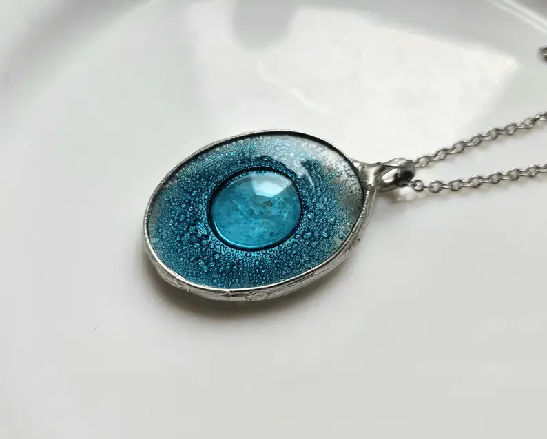 Piękny wisior ze szkłem w kolorze turkusowym z mnóstwem bąbelków w oprawie koloru srebrnego.