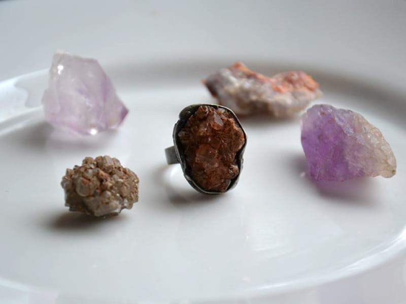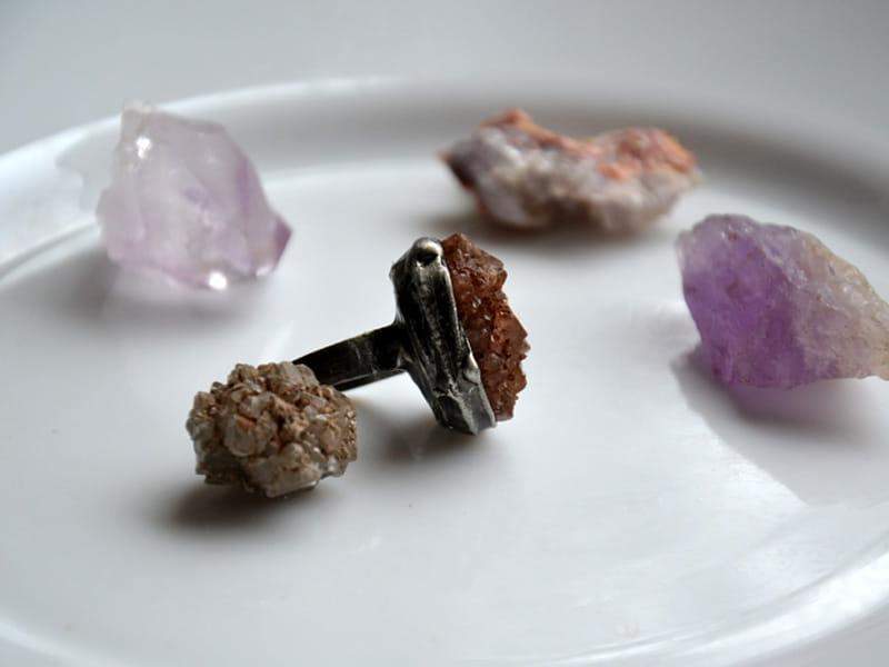 Rustykalny pierścionek z surowym aragonitem. Wymiary oczka pierścionka to 2,5 x 2 cm. Oprawa wykonana z miedzi pokrytej ekologiczną cyną stylizowaną na stare srebro. Obrączka regulowana. Biżuteria w 100% wykonana ręcznie, poszczególne sztuki mogą się minimalnie różnić.