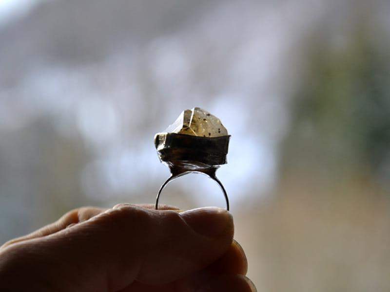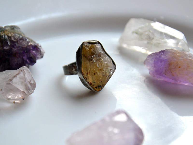 Rustykalny pierścionek z surowym cytrynem. Wymiary oczka pierścionka to 2,5 x 2 cm. Oprawa wykonana z miedzi pokrytej ekologiczną cyną stylizowaną na stare srebro. Obrączka regulowana. Biżuteria w 100% wykonana ręcznie, poszczególne sztuki mogą się minimalnie różnić.