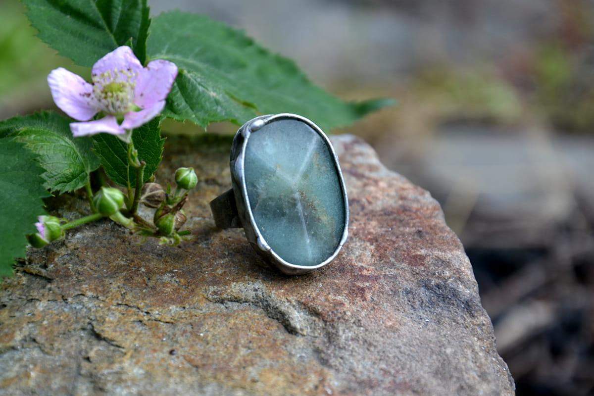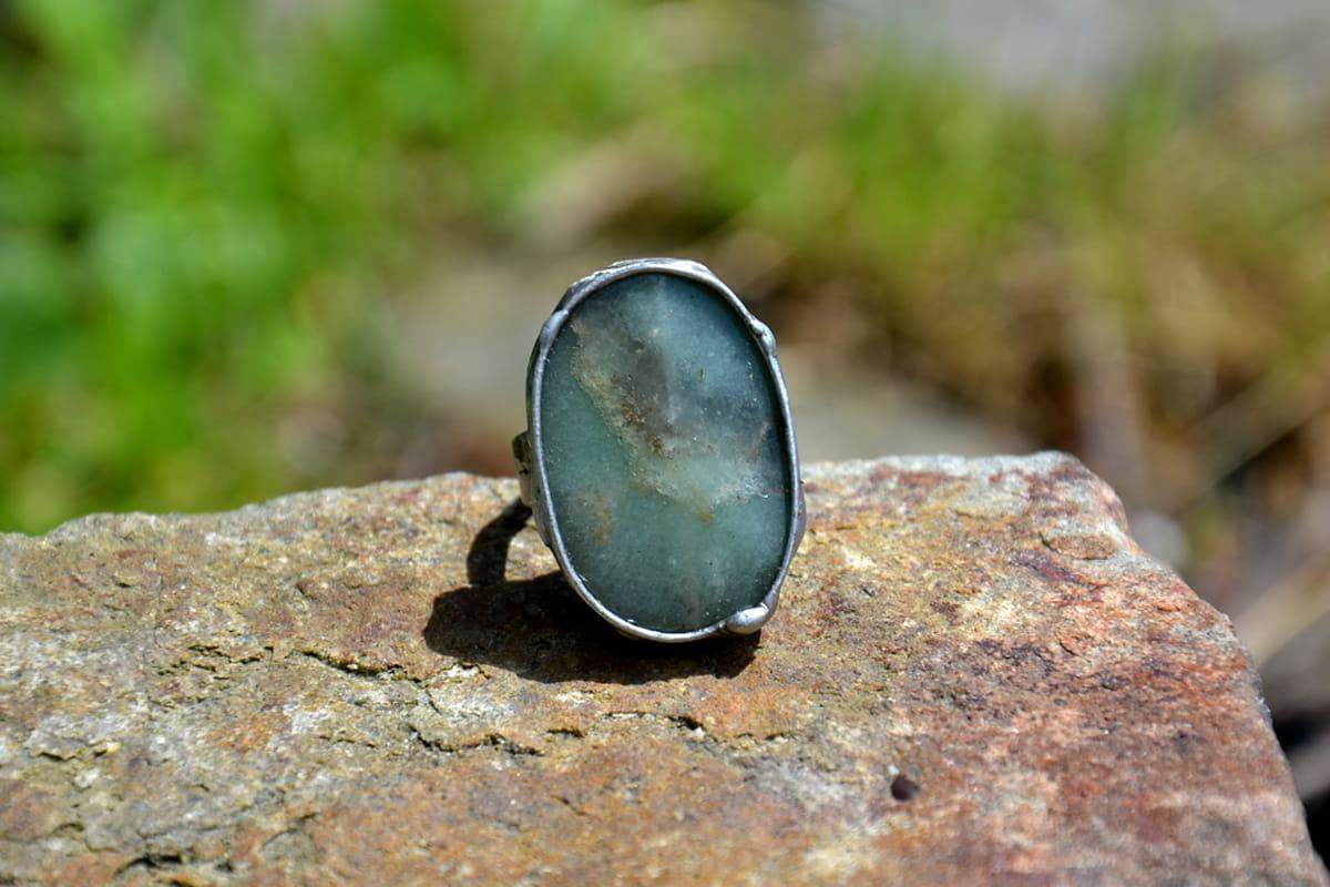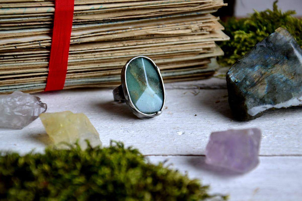 Unikatowy pierścionek z akwamarynem. Wymiary kamienia to 3 x 2 cm. Oprawa wykonana z miedzi pokrytej ekologiczną cyną stylizowaną na stare srebro. Obrączka regulowana. Biżuteria w 100% wykonana ręcznie, poszczególne sztuki mogą się minimalnie różnić.